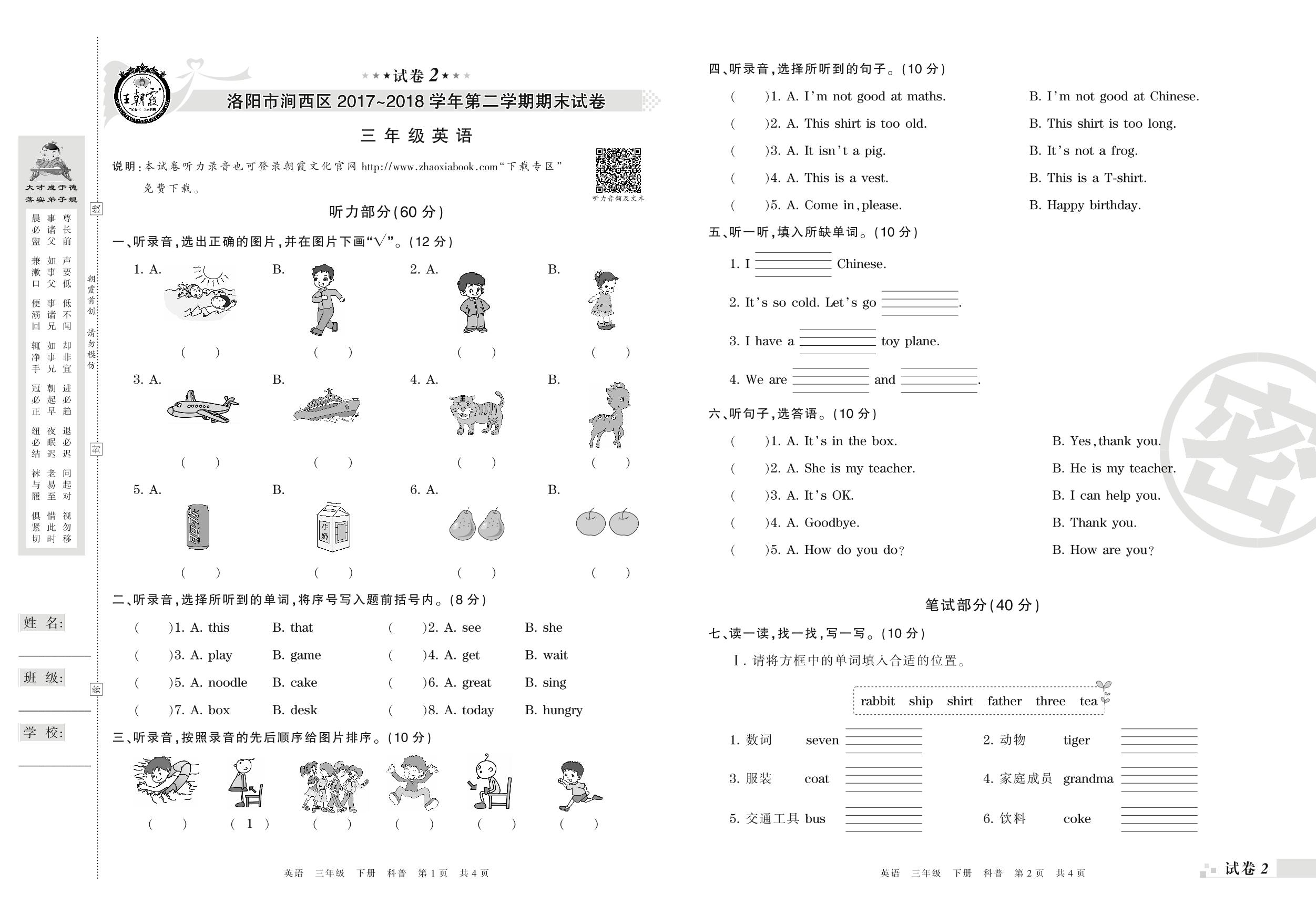2017-2018学年第二学期洛阳市涧西区三年级英语试卷(科普版)【2】