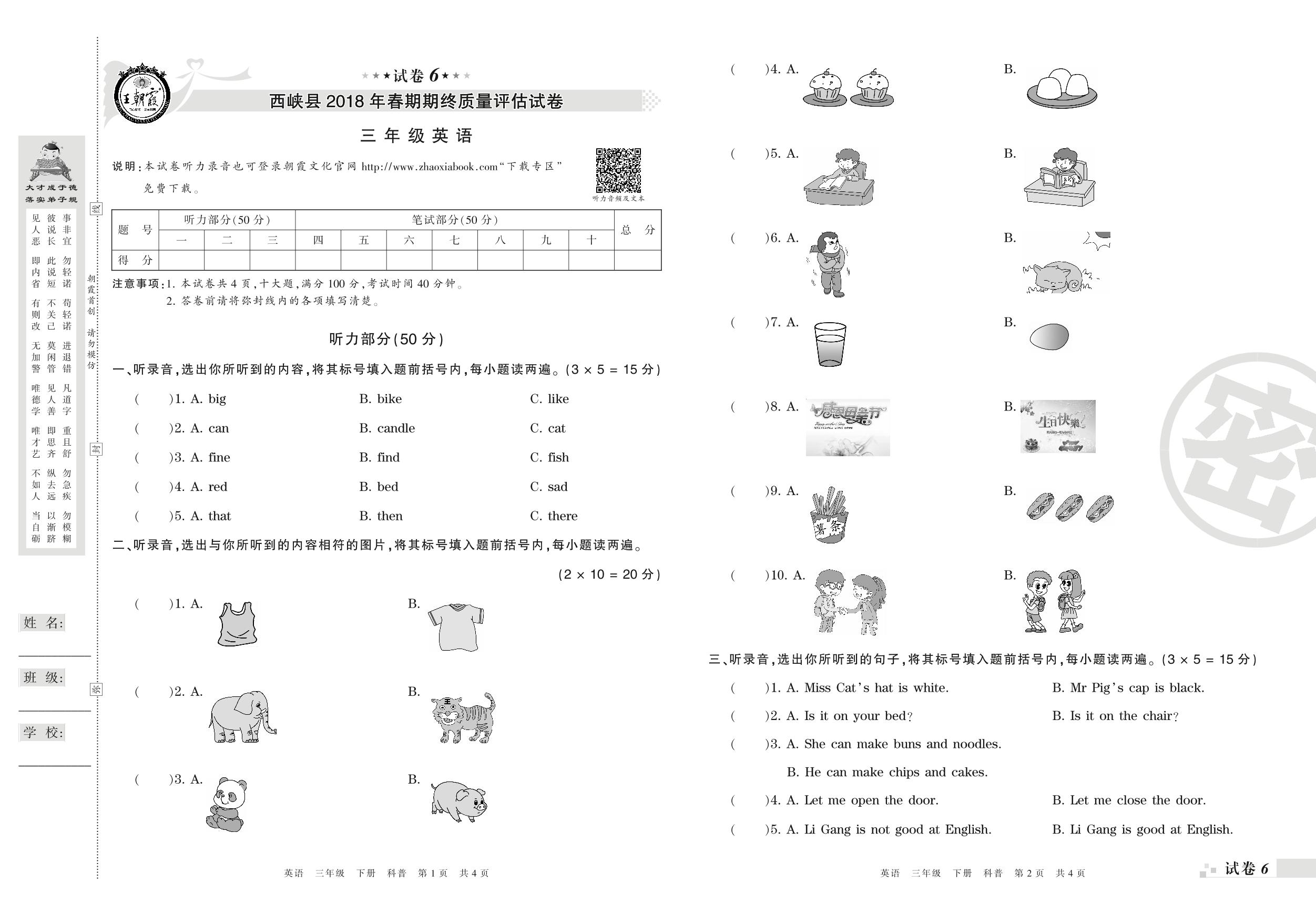 2017-2018学年第二学期南阳市西峡县三年级英语试卷(科普版)【6】