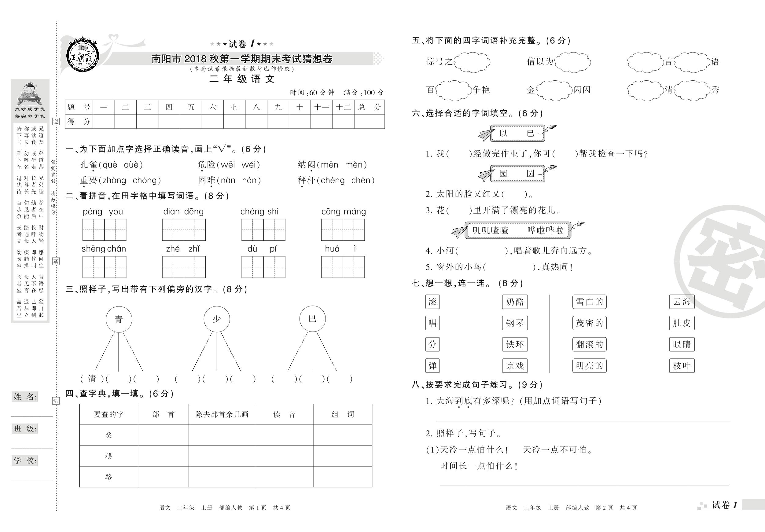 2018-2019学年第一学期南阳市二年级语文试卷(人教版)【1】