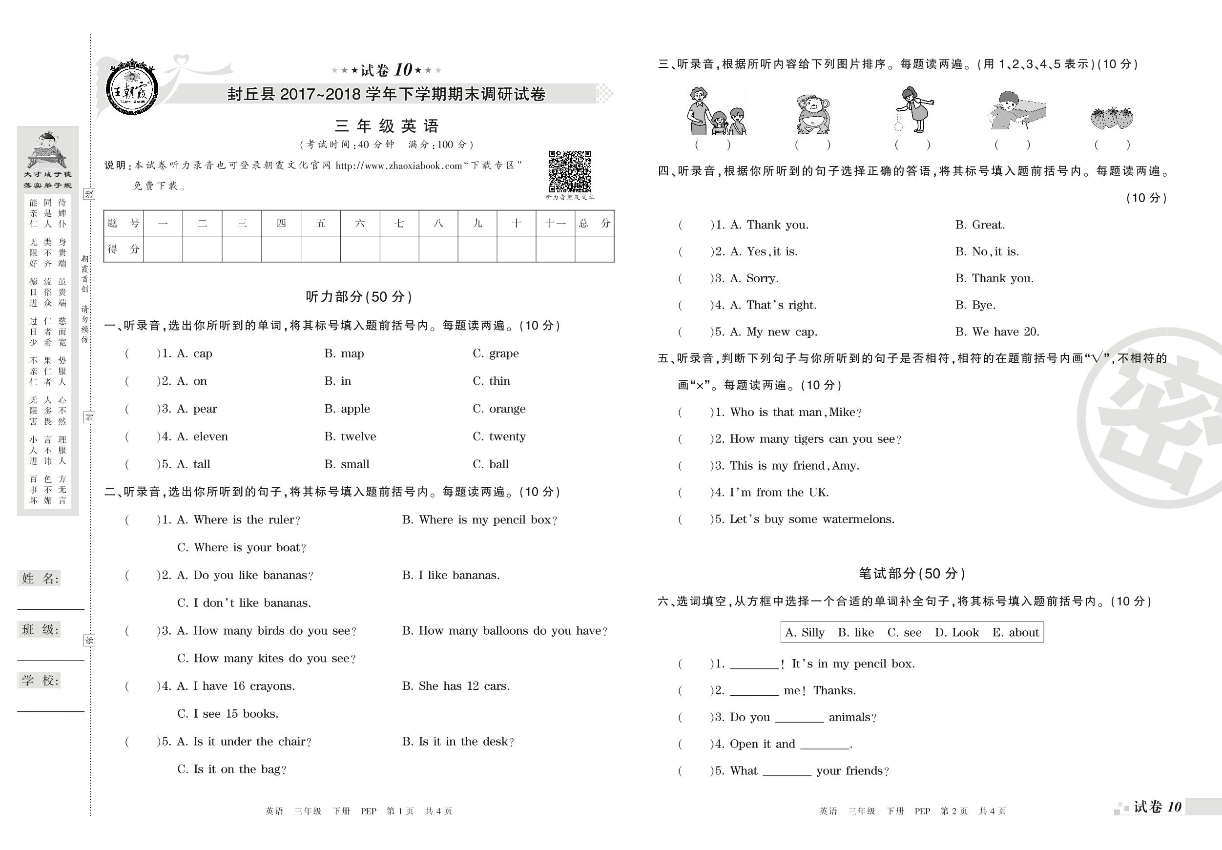 2017-2018学年第二学期新乡市封丘县三年级英语试卷(PEP版)【10】