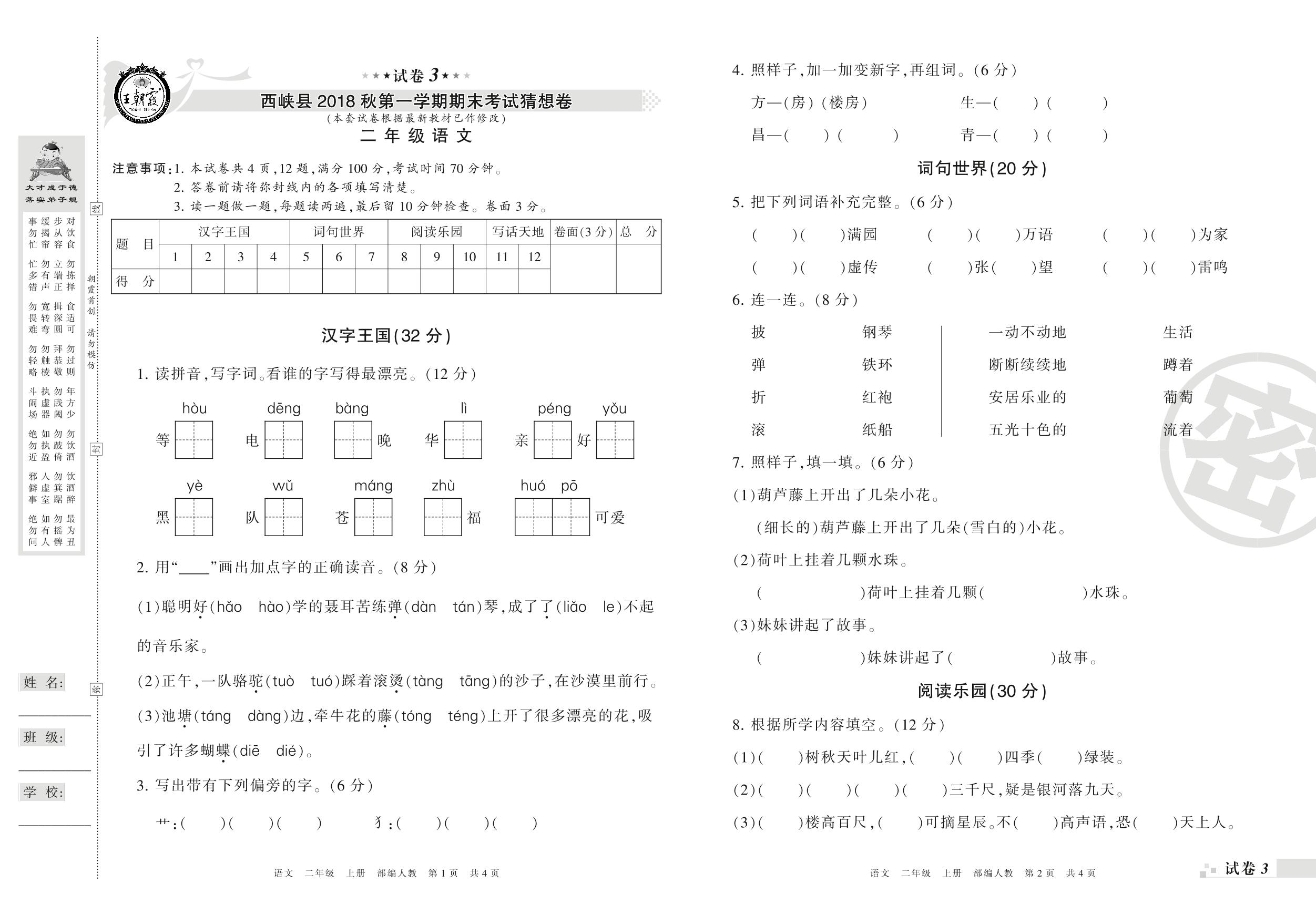 2018-2019学年第一学期南阳市西峡县二年级语文试卷(人教版)_R21080180613【3】
