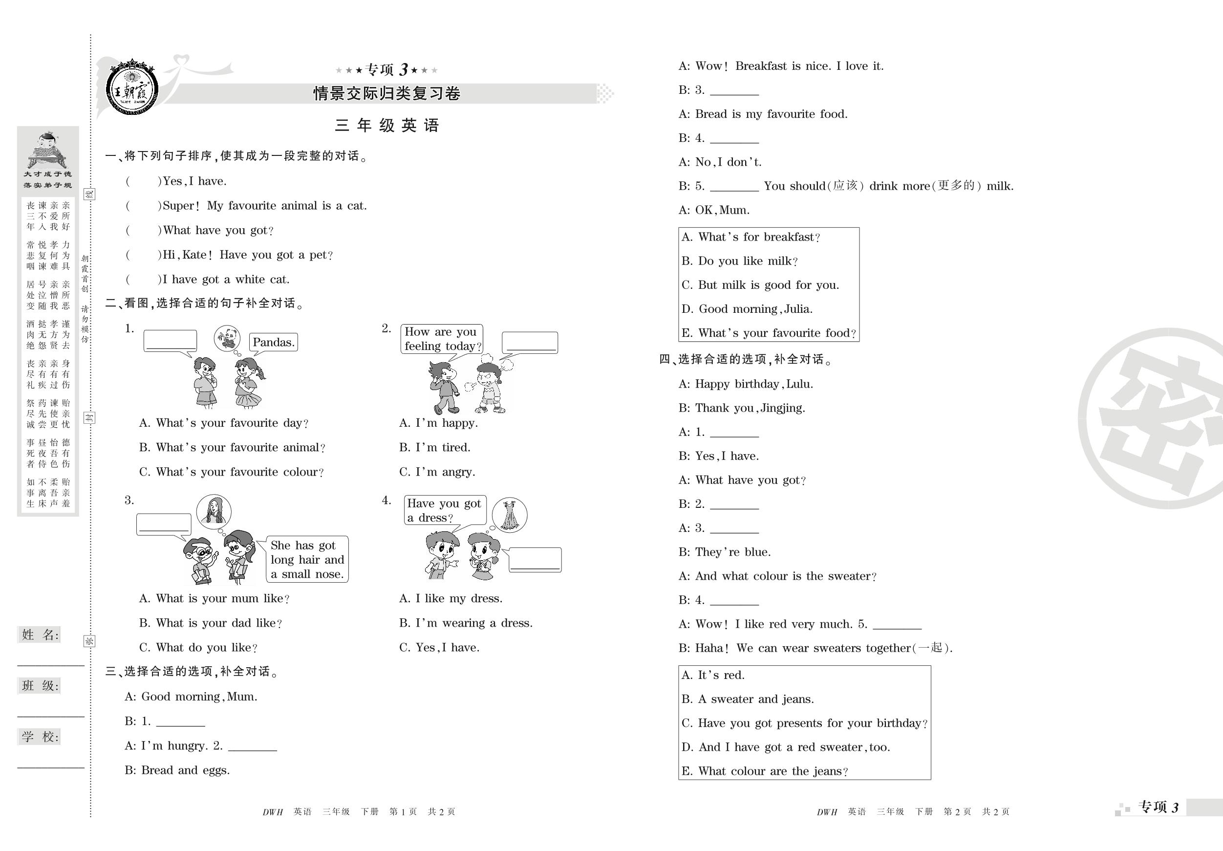 王朝霞期末专项卷——情景交际、阅读理解真题归类复习卷三年级下册英语(剑桥版)_R210806192149【0】