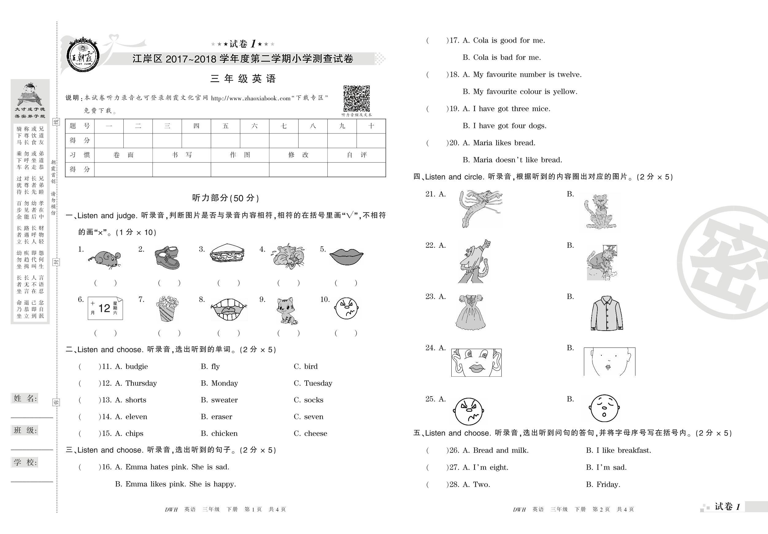 2017-2018学年第二学期武汉市江岸区三年级英语试卷(剑桥版)【1】