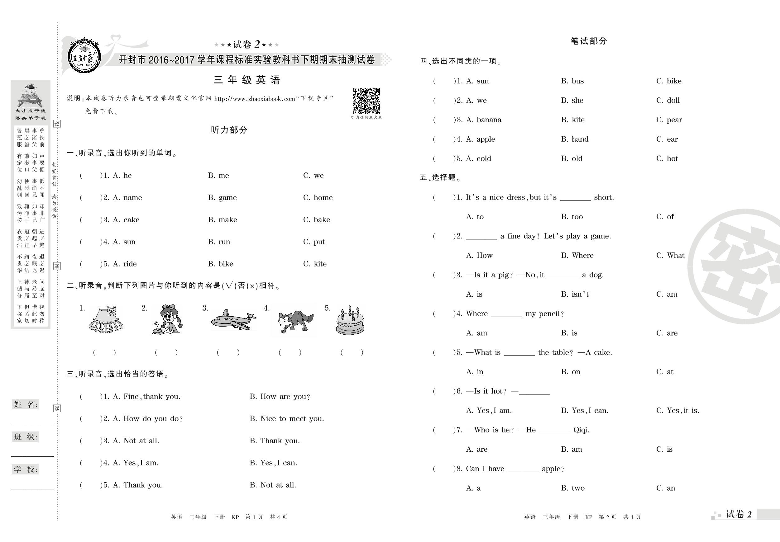 2016-2017学年第二学期开封市三年级英语试卷(科普版)【2】
