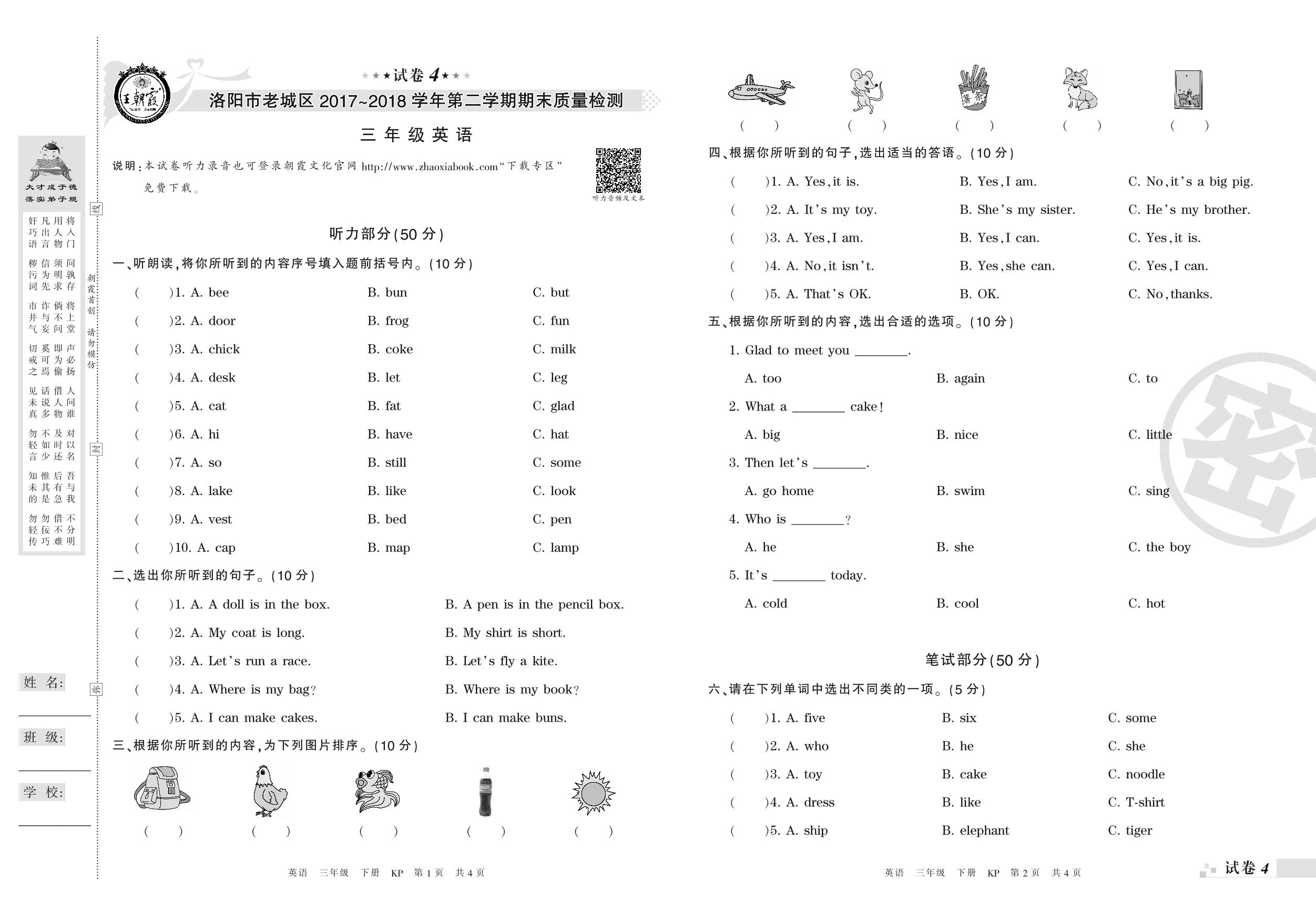 2017-2018学年第二学期洛阳市老城区三年级英语试卷(科普版)_R210806192250【4】