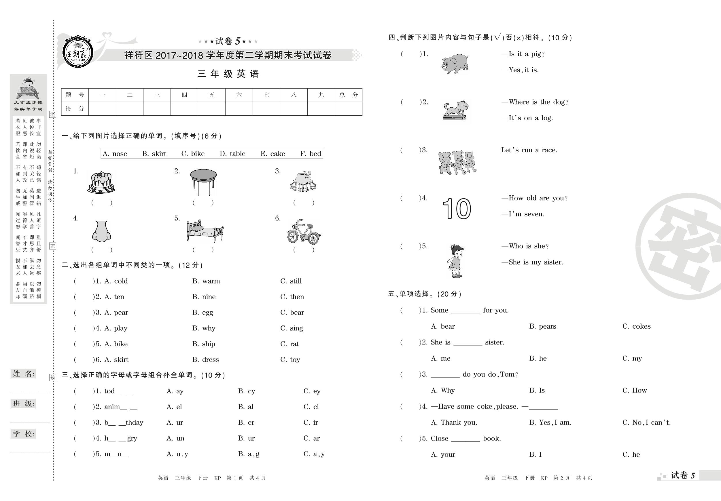 2017-2018学年第二学期开封市祥符区三年级英语试卷(科普版)【5】