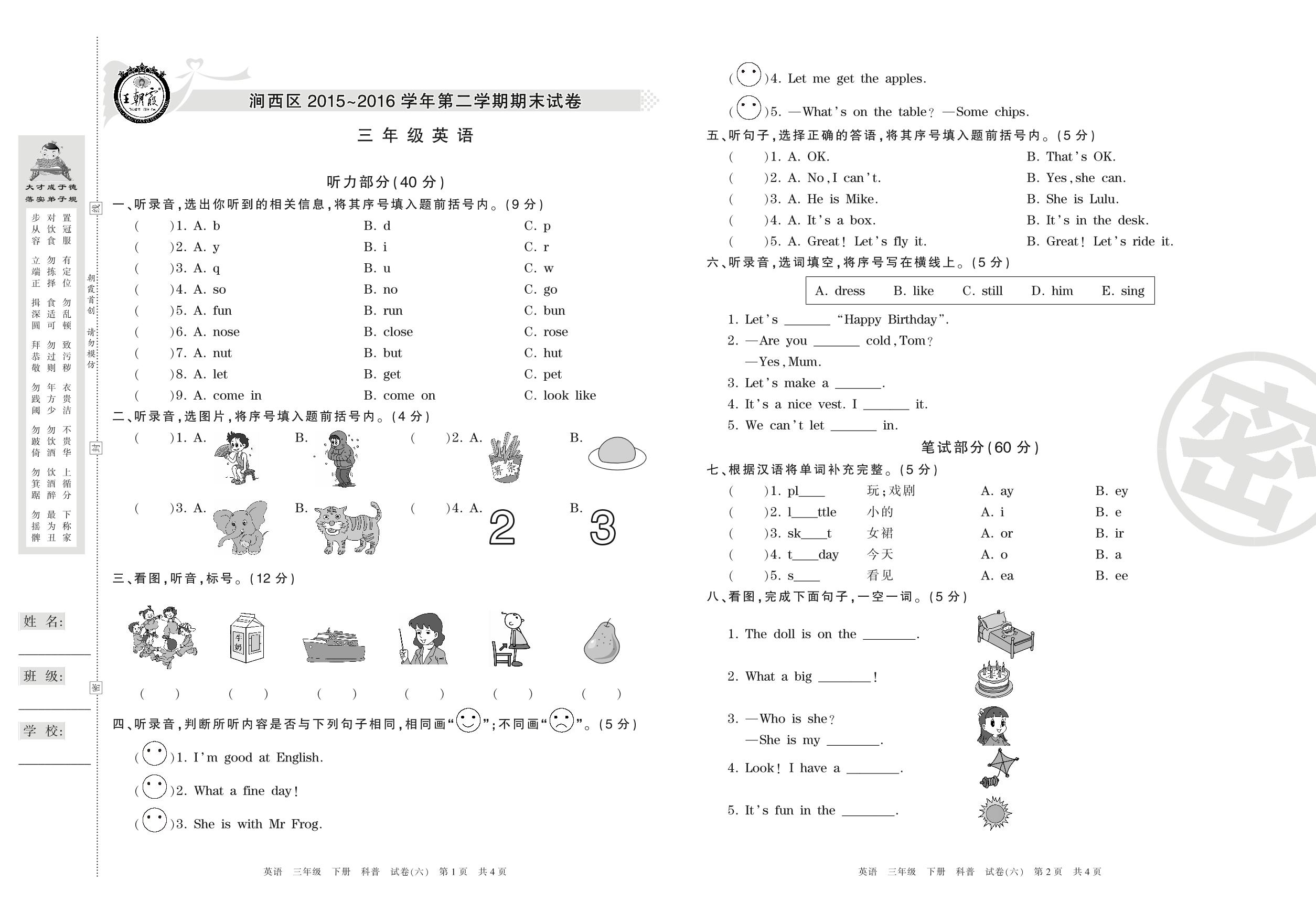 三年级英语科普版下册专项卷