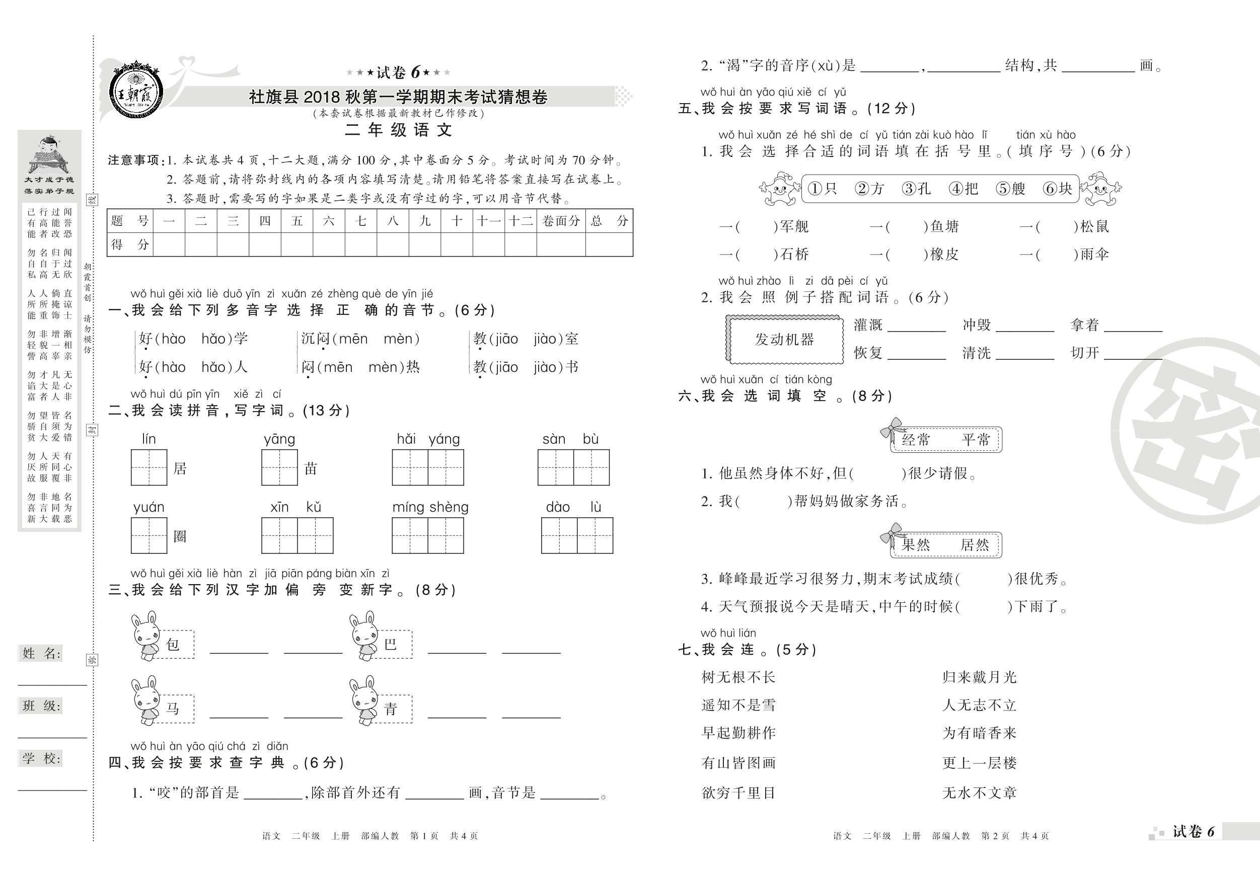 2018-2019学年第一学期南阳市社旗县二年级语文试卷(人教版)-R21080180619【6】