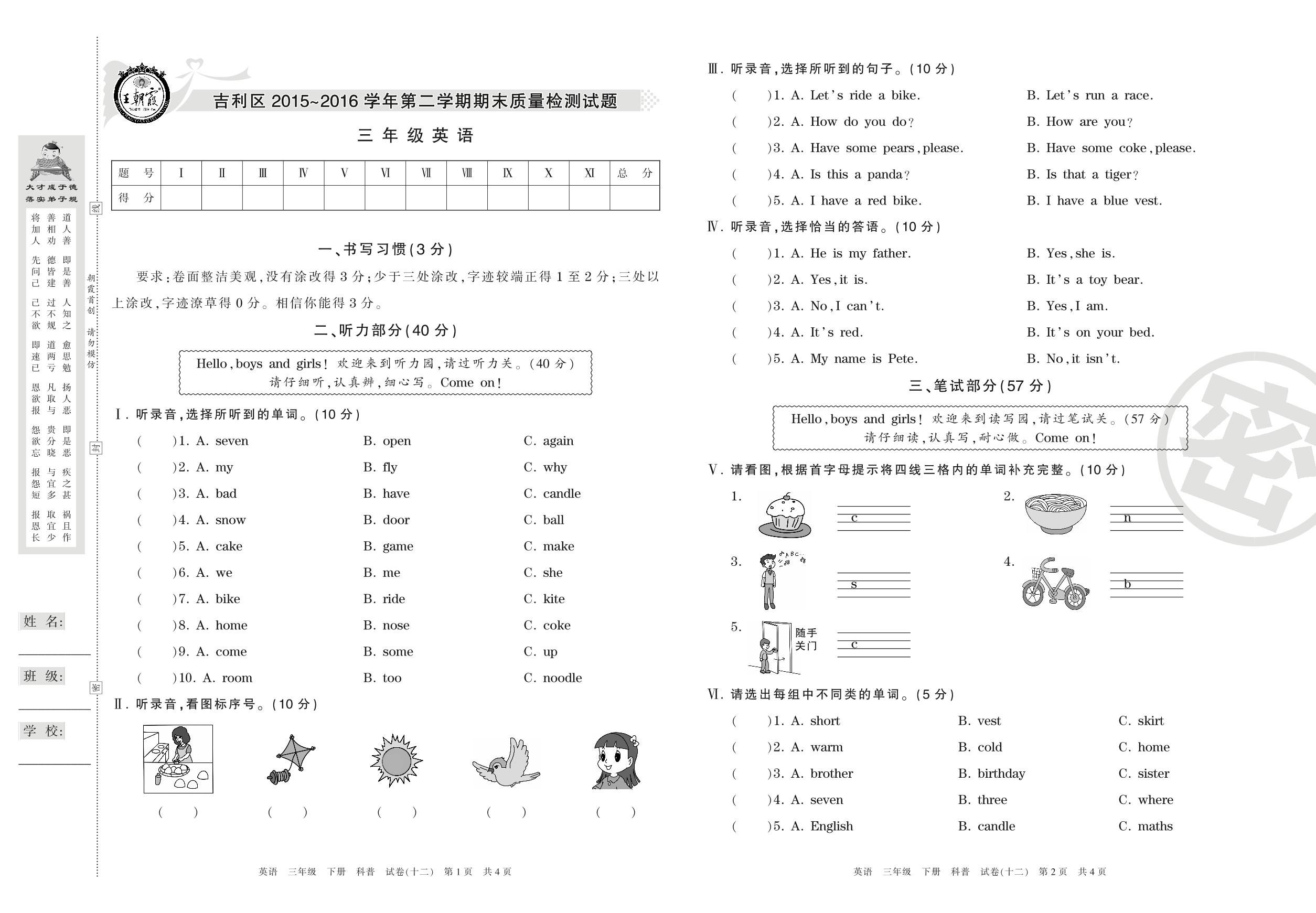 2015-2016学年第二学期洛阳市吉利区三年级英语试卷(科普版)【12】
