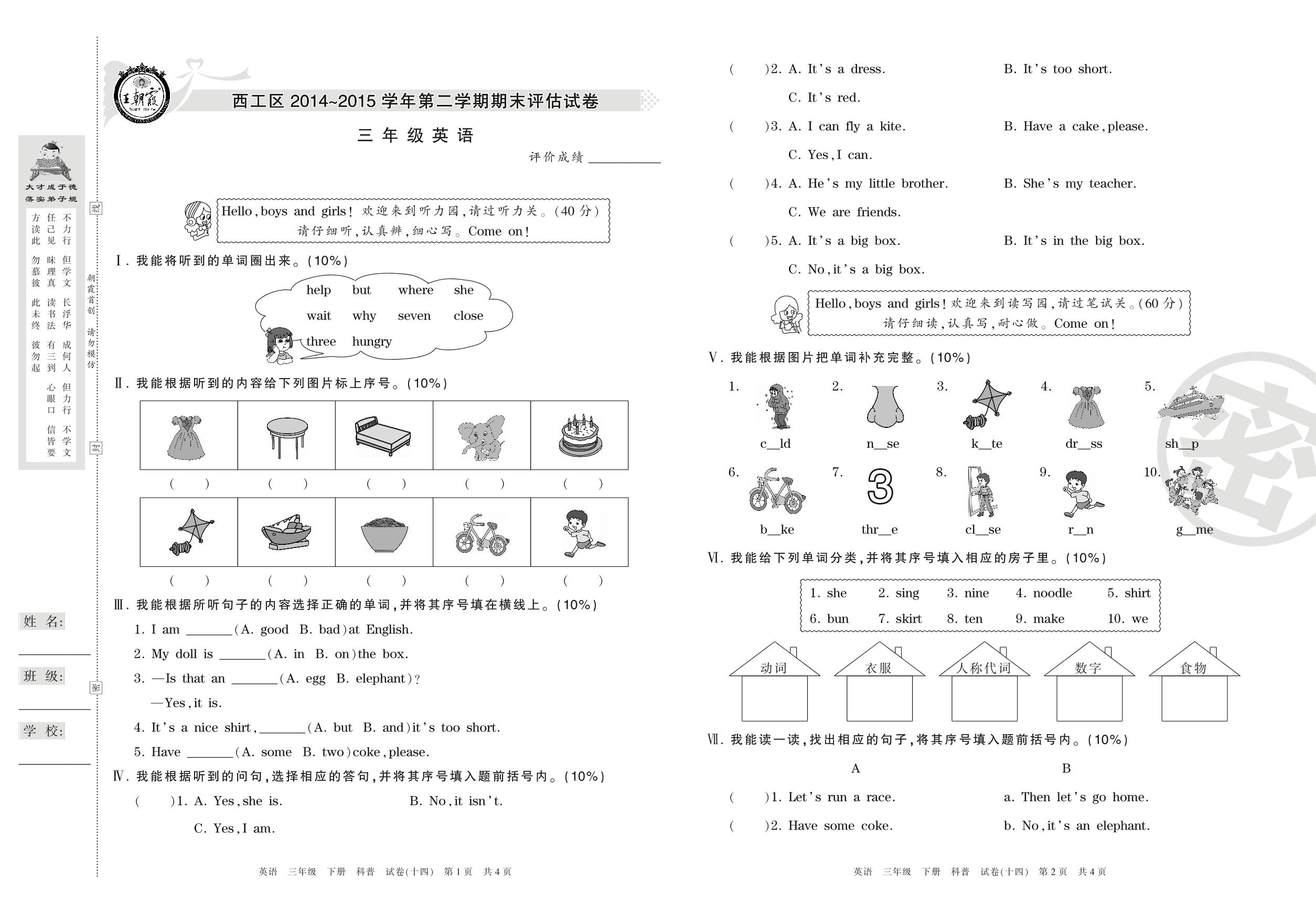 2014-2015学年第二学期洛阳市西工区三年级英语试卷(科普版)【14】