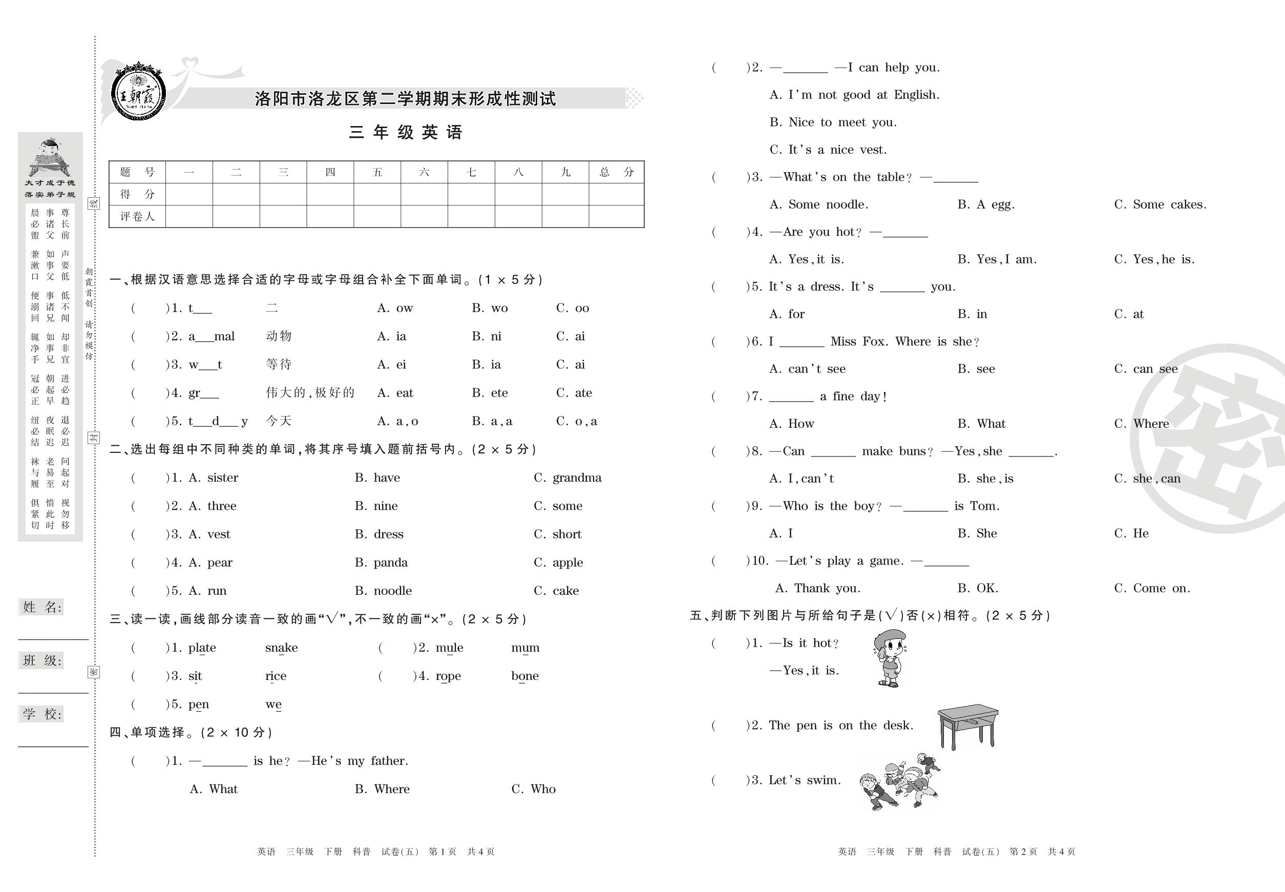 2015-2016学年第二学期洛阳市洛龙区三年级英语试卷(科普版)【5】
