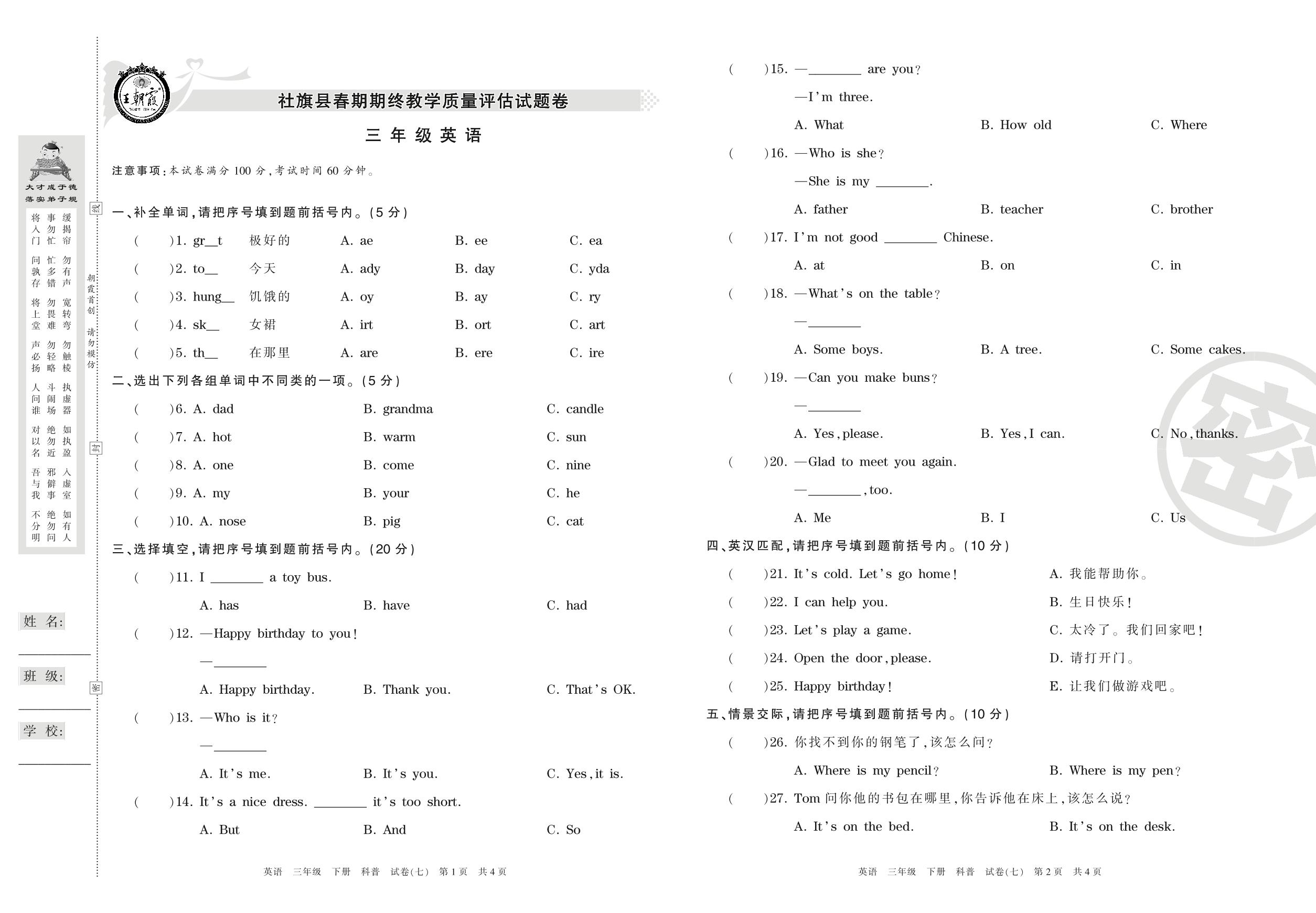2015-2016学年第二学期南阳市社旗县三年级英语试卷(科普版)【7】