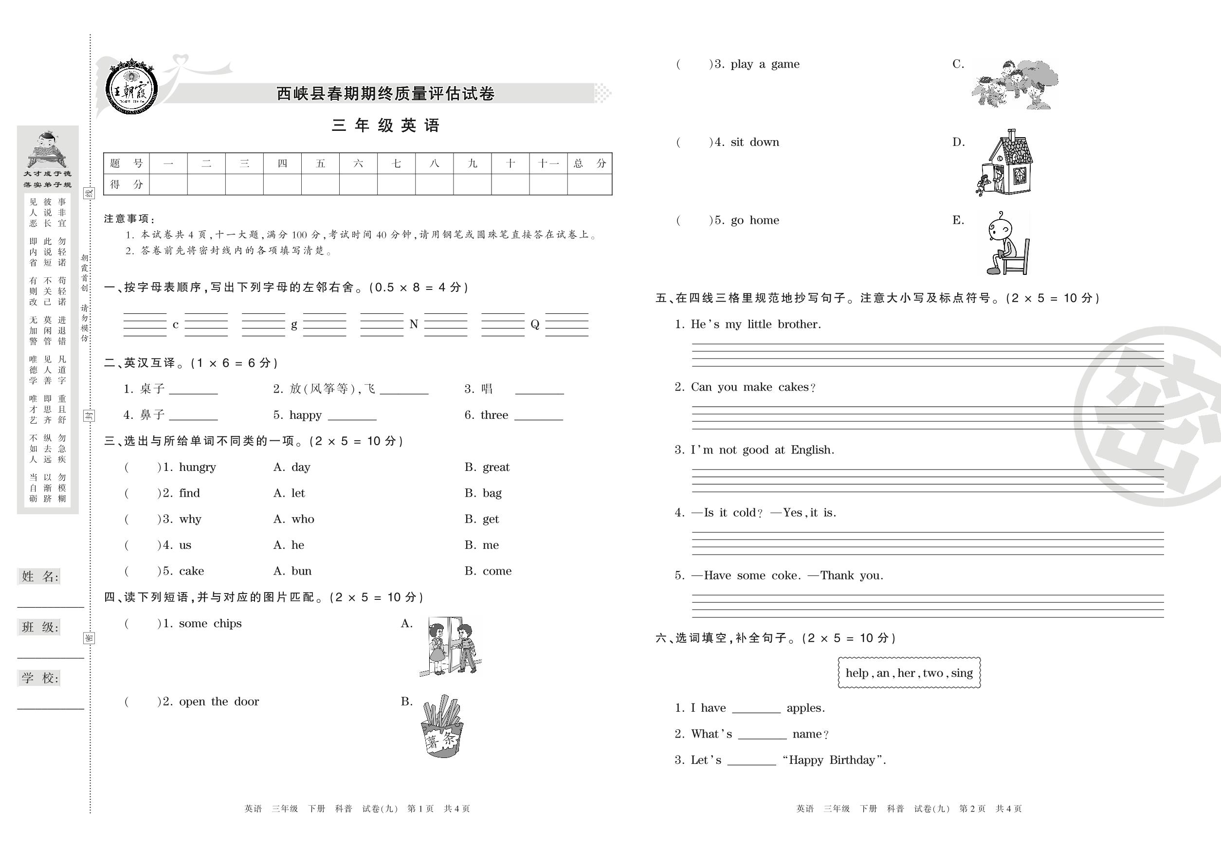 2015-2016学年第二学期南阳市西峡县三年级英语试卷(科普版)【9】