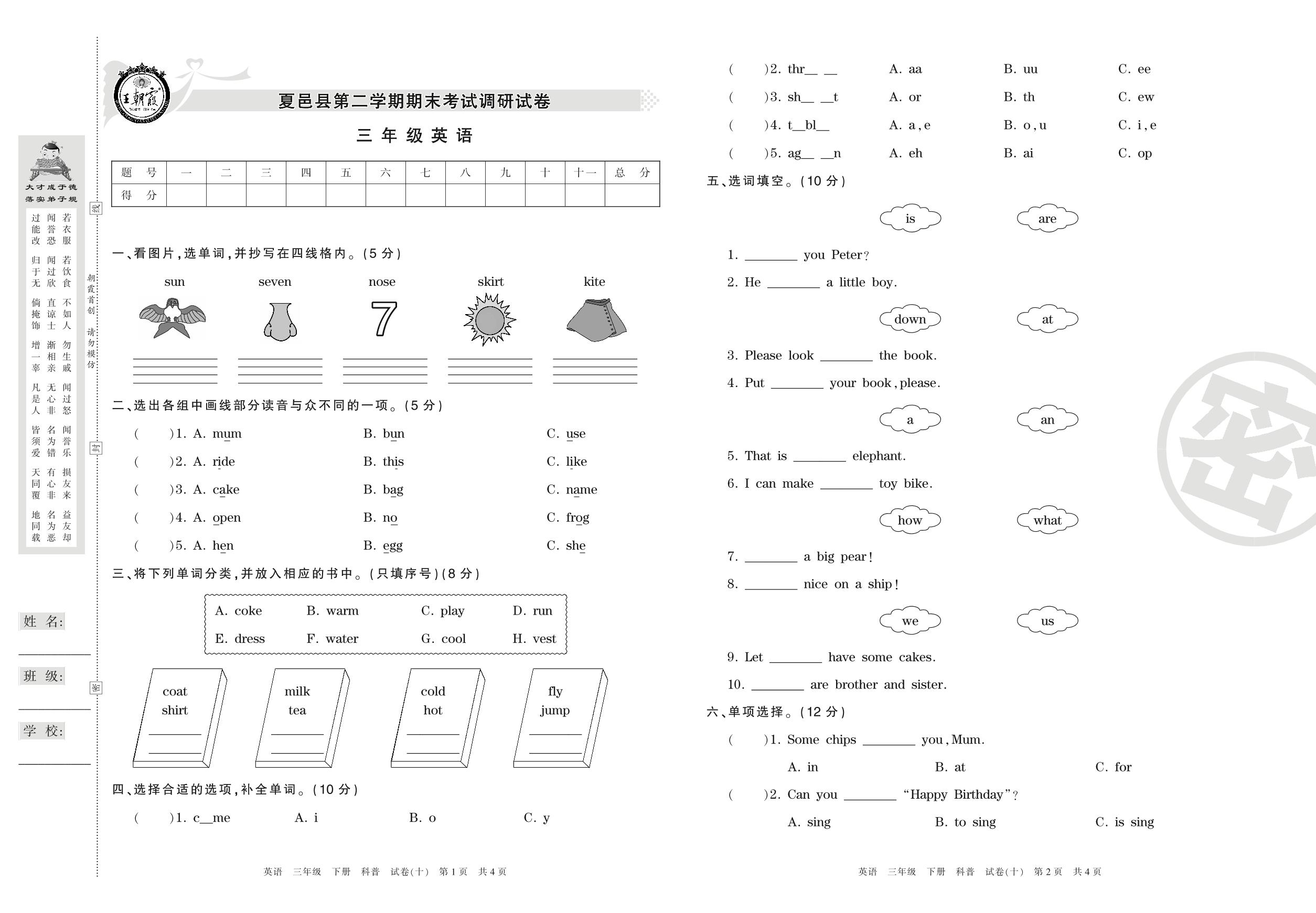 2015-2016学年第二学期商丘市夏邑县三年级英语试卷(科普版)【10】