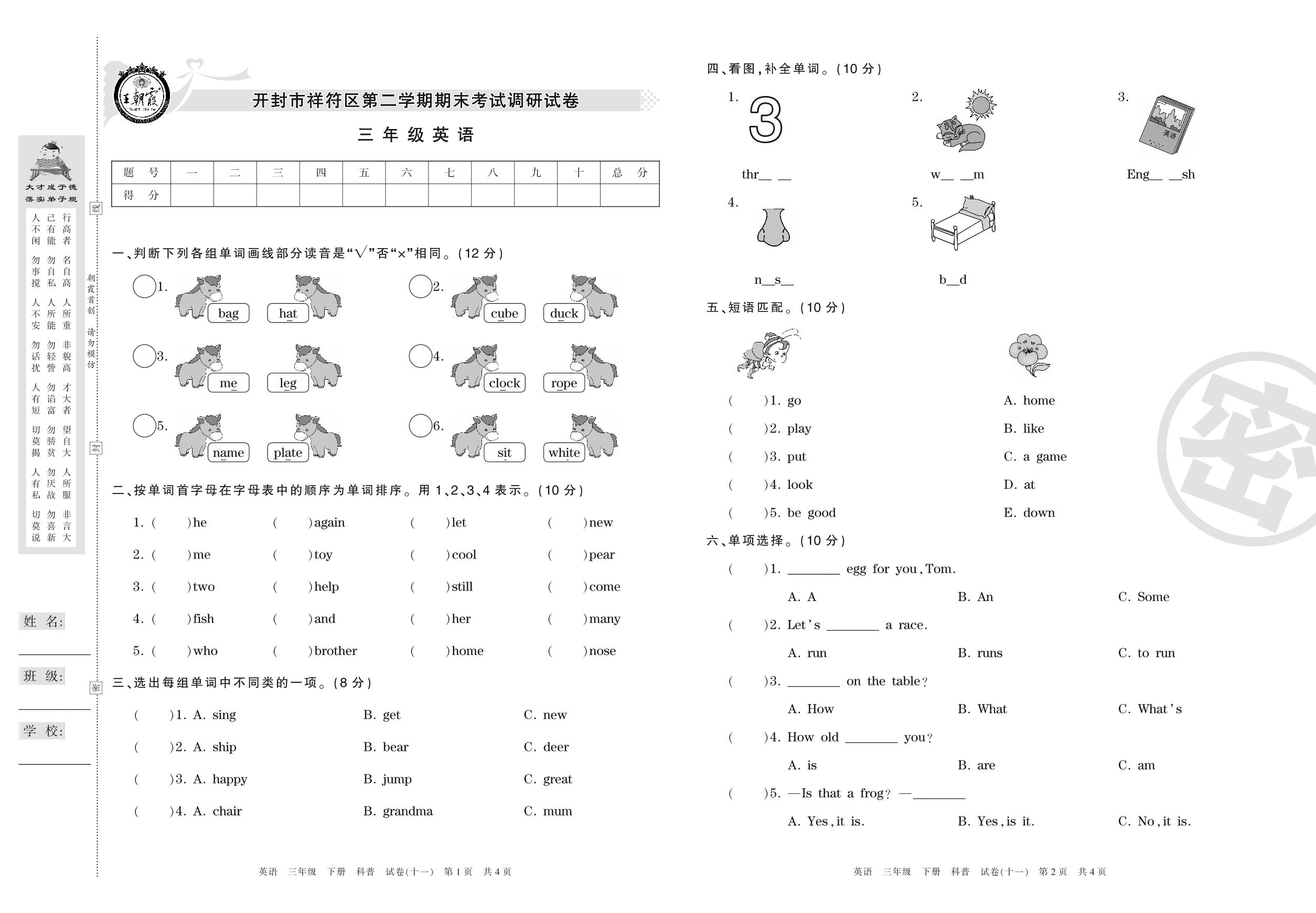 2015-2016学年第二学期开封市三年级英语试卷(科普版)【11】