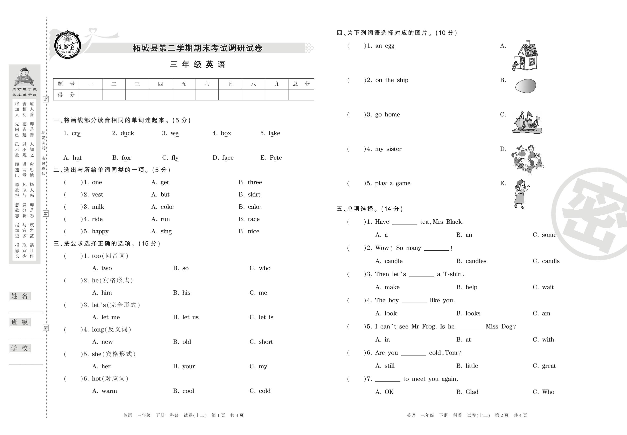 三年级英语科普版下册期末卷
