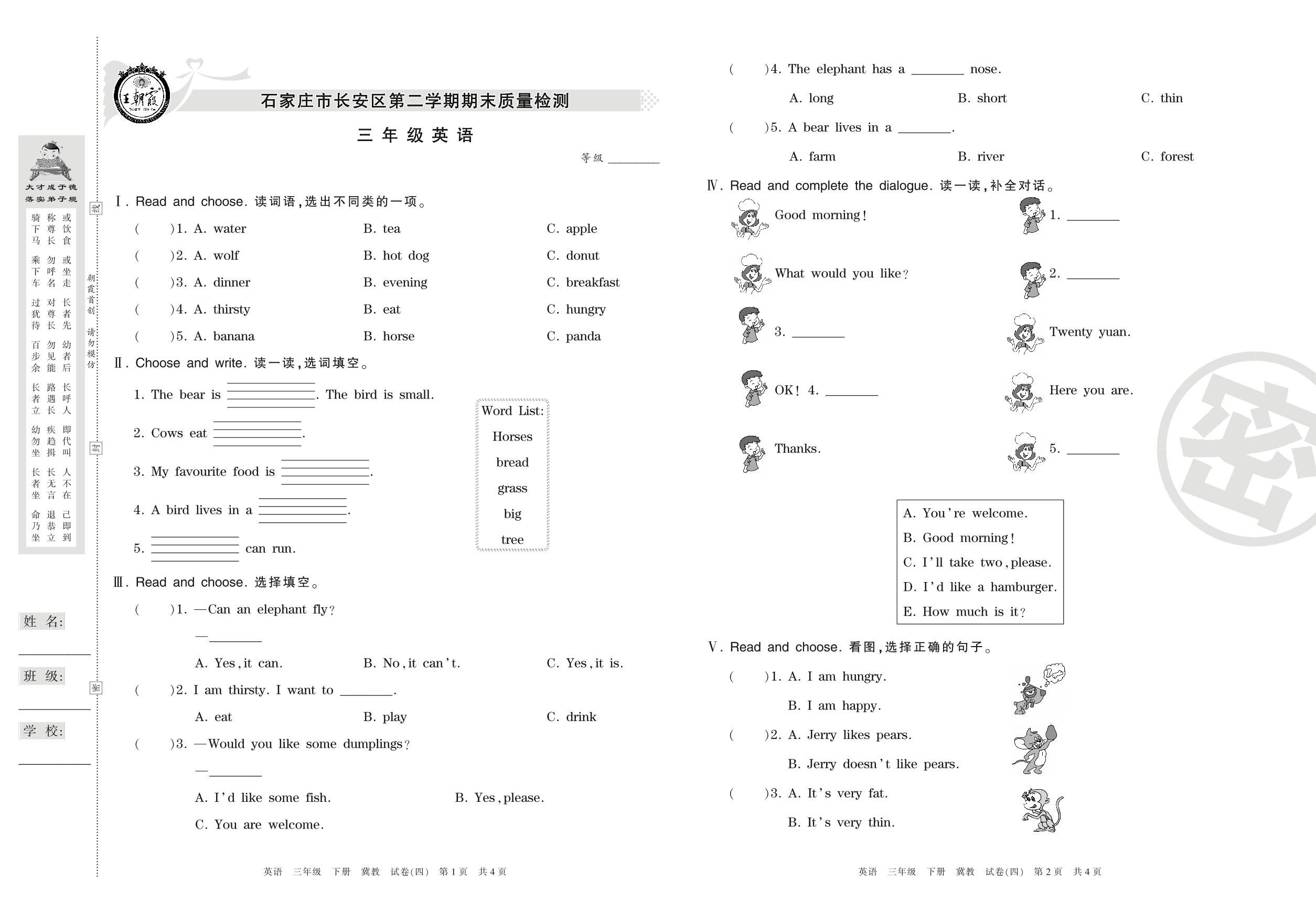 2015-2016学年第二学期石家庄市长安区三年级英语试卷(冀教版)【4】