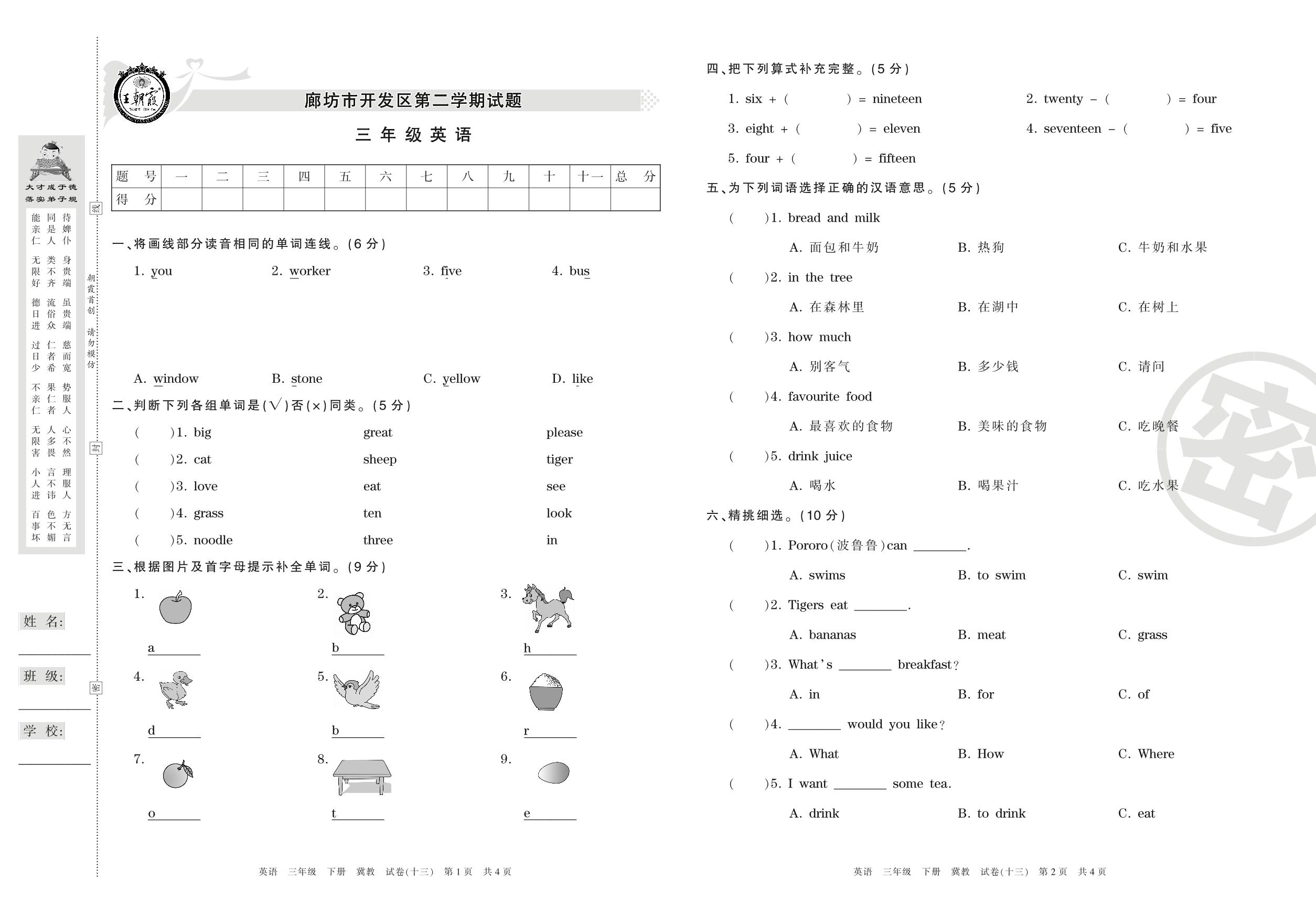 三年级英语冀教版下册期末卷