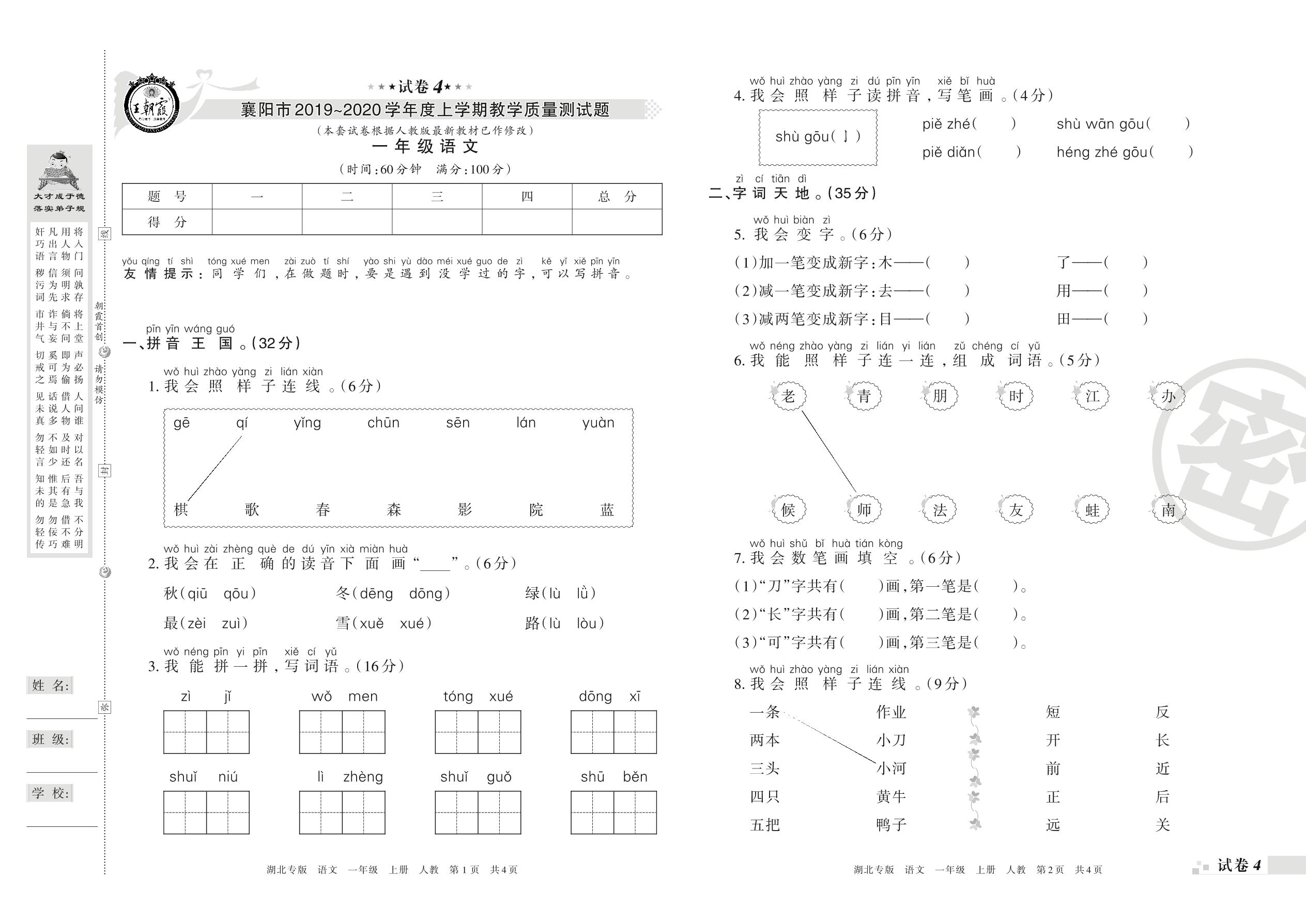 2019-2020学年第一学期襄阳市一年级语文试卷(人教版)【4】