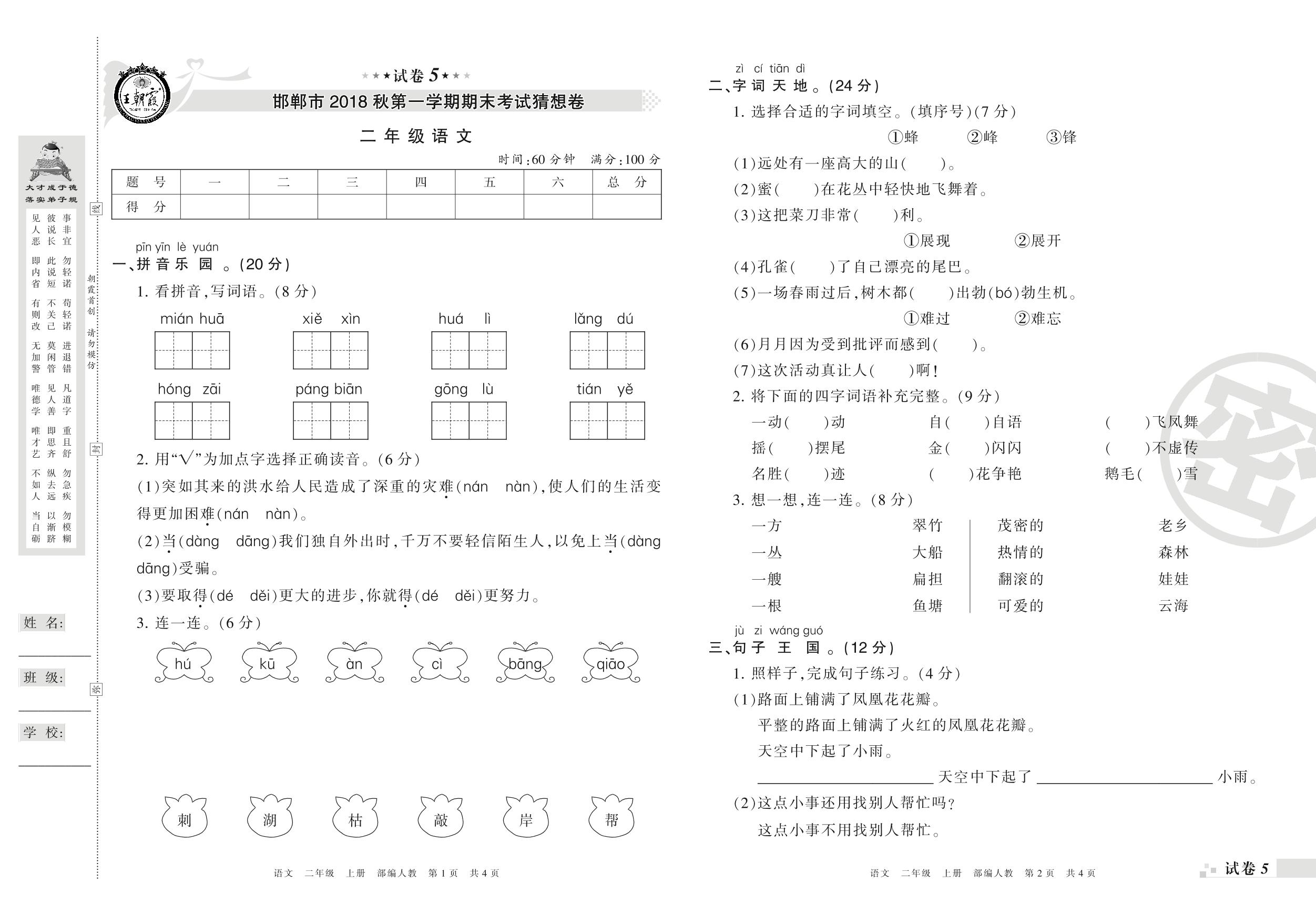 2018-2019学年第一学期邯郸市二年级语文试卷(人教版)【5】