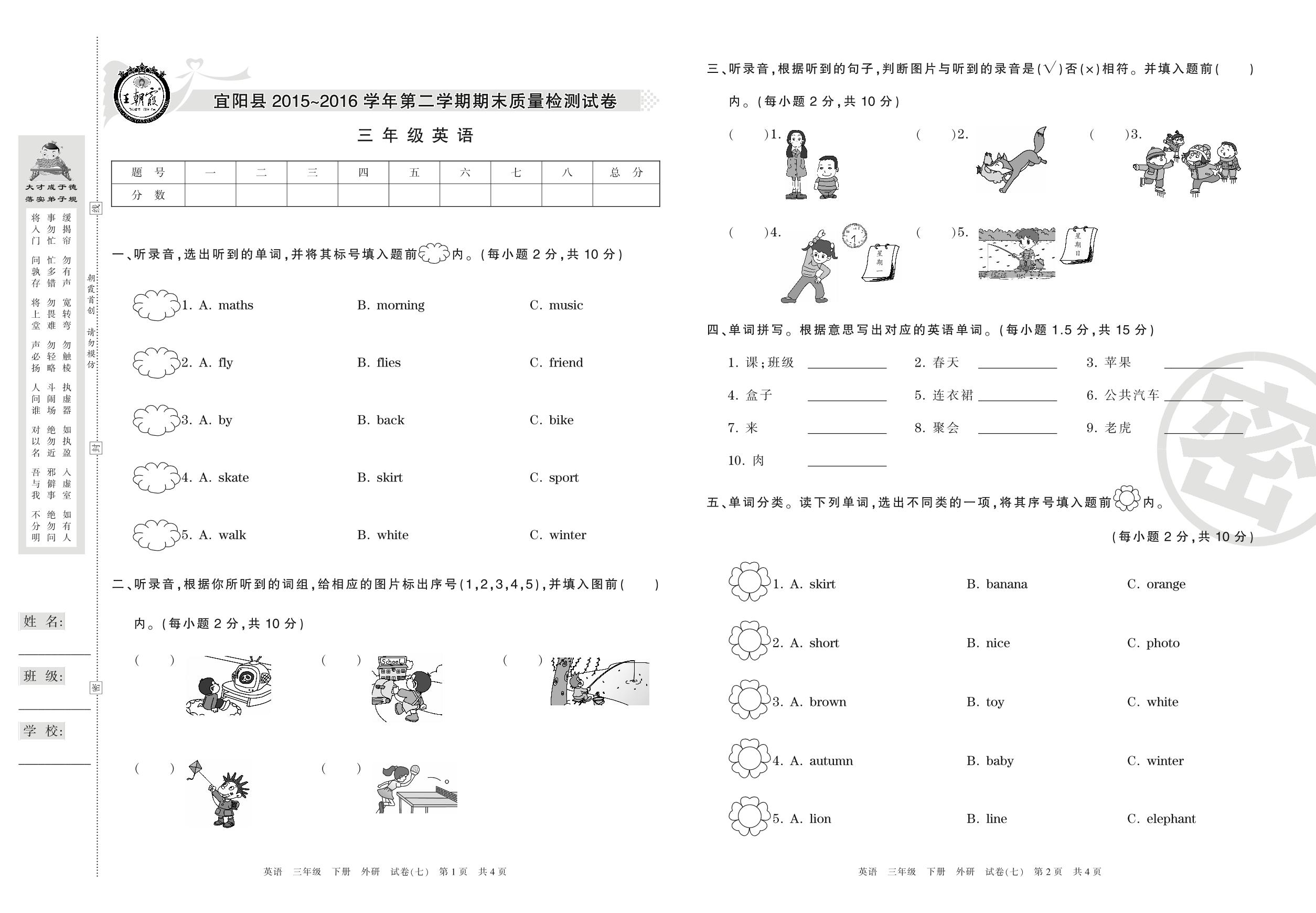 2015-2016学年第二学期洛阳市宜阳县三年级英语试卷(外研版)【7】