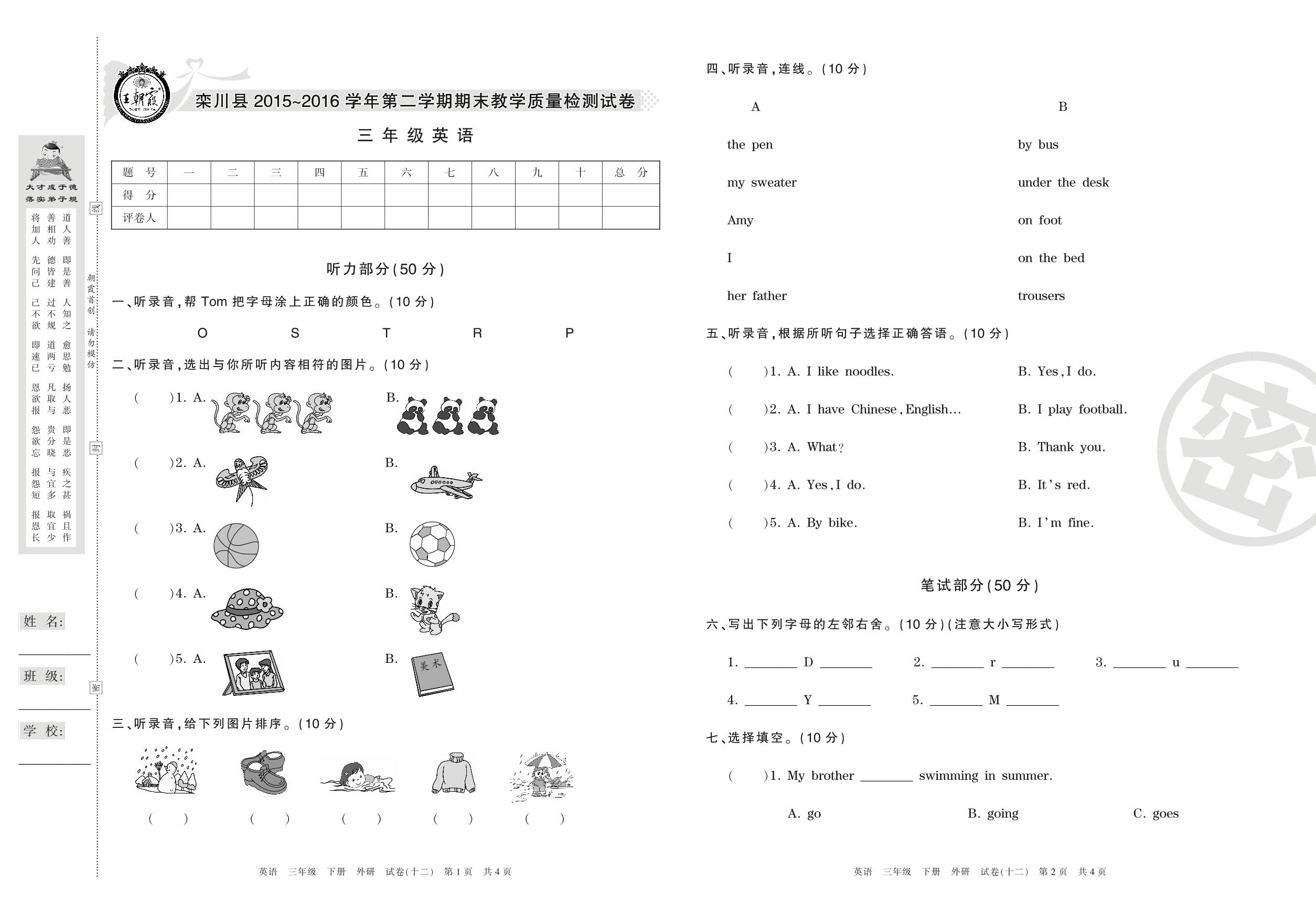 2015-2016学年第二学期洛阳市栾川县三年级英语试卷(外研版)【12】