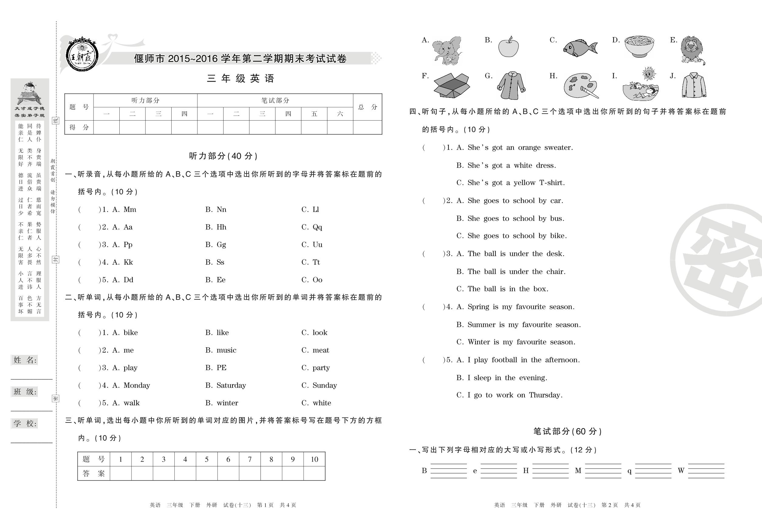 2015-2016学年第二学期偃师市三年级英语试卷(外研版)【13】
