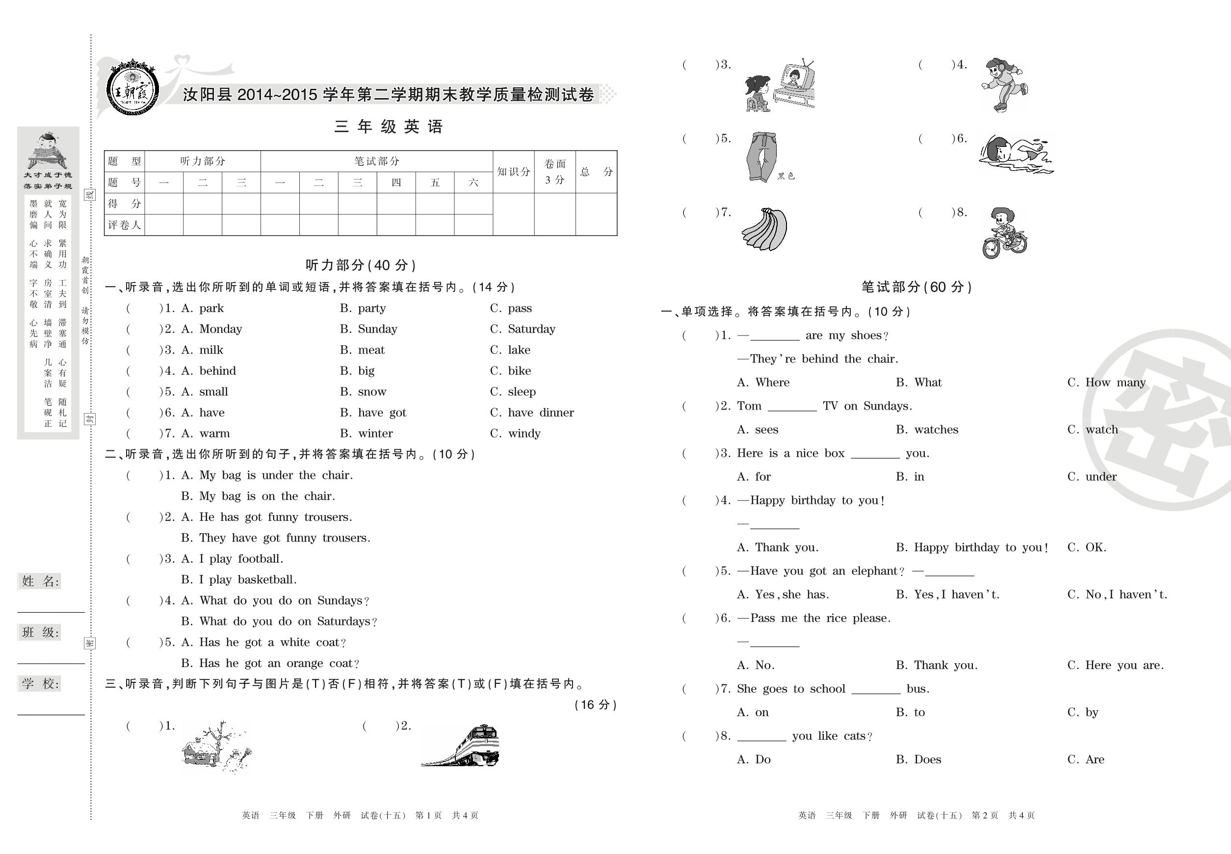 2014-2015学年第二学期洛阳市汝阳县三年级英语试卷(外研版)【15】