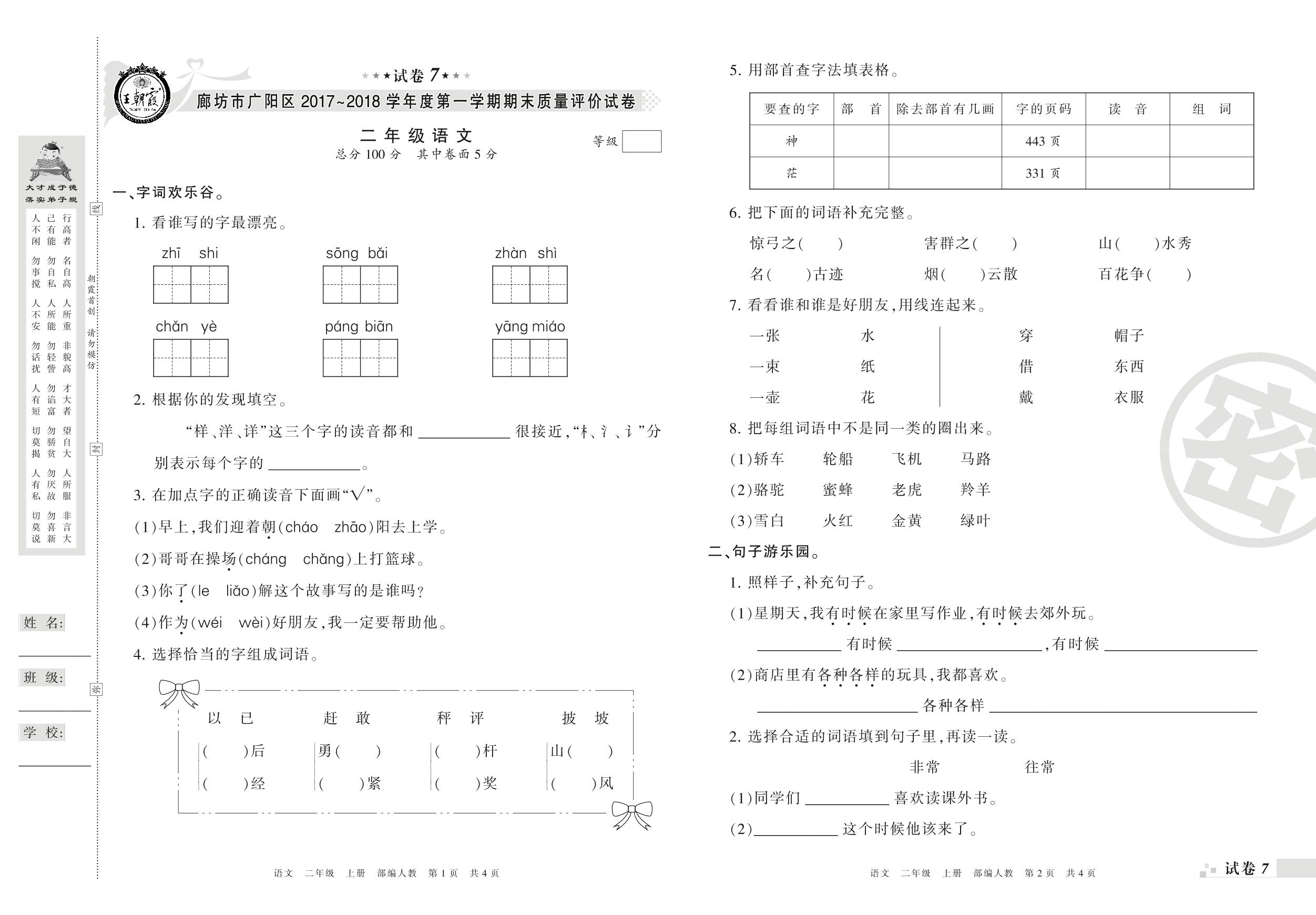 2017-2018学年第一学期廊坊市广阳区二年级语文试卷(人教版)【7】