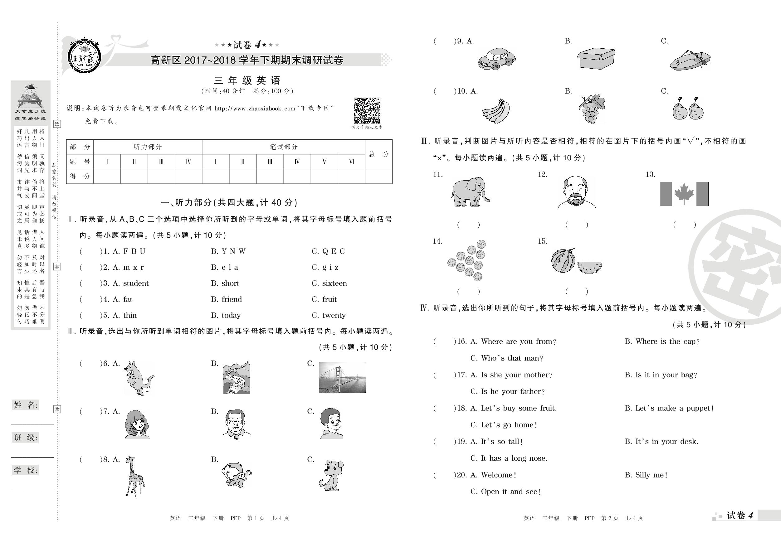 2017-2018学年第二学期郑州市高新区三年级英语试卷(PEP版)【4】