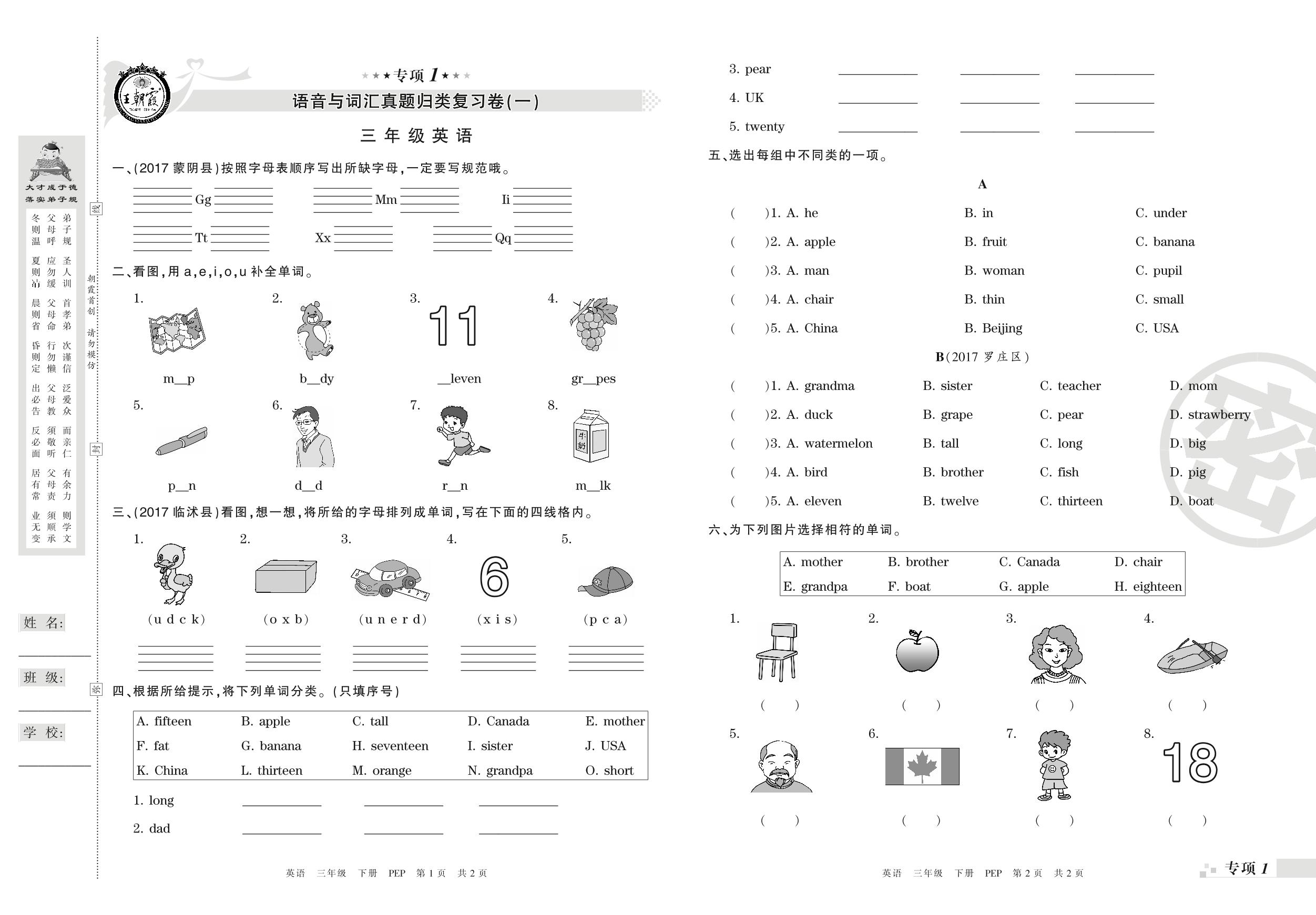 王朝霞期末专项卷——语音与词汇(一)(二)真题归类复习卷三年级下册英语(PEP版)_R210806192750【0】