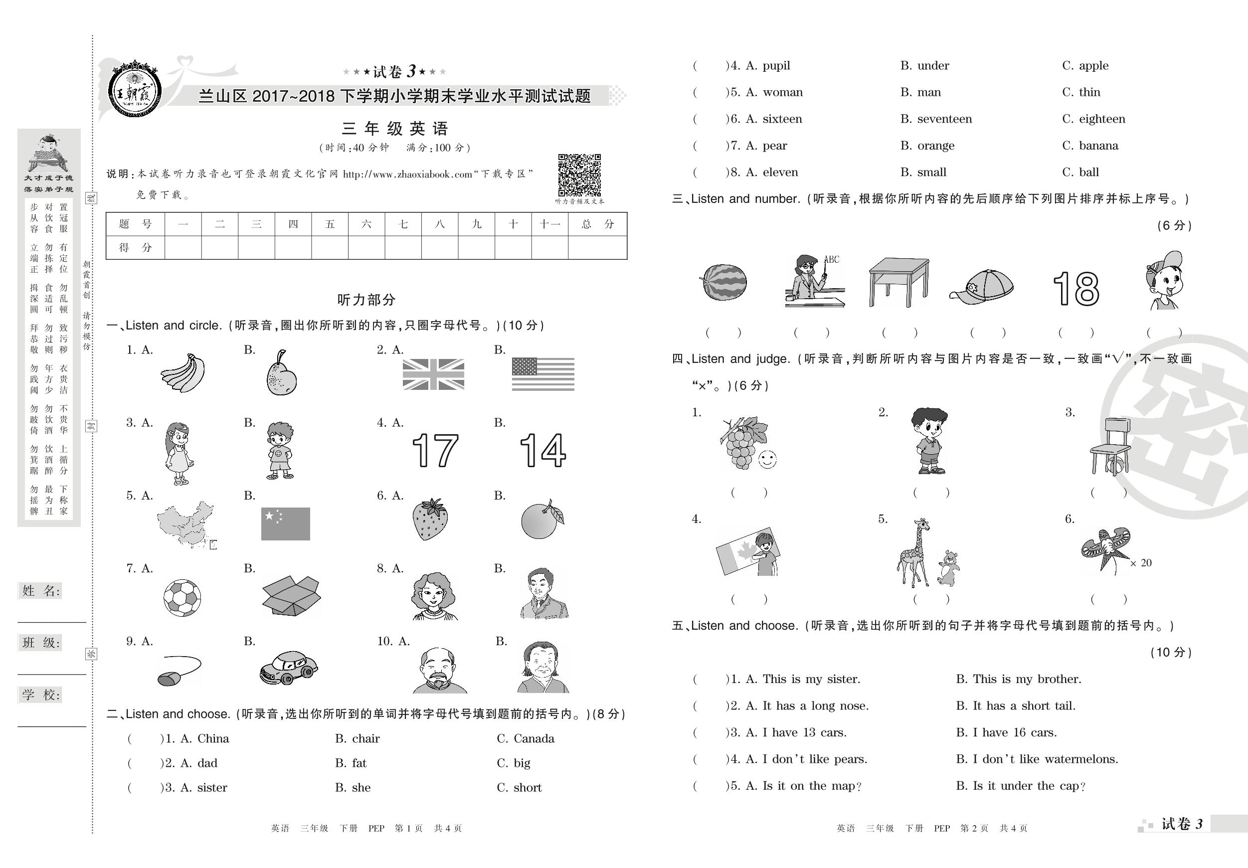 2017-2018学年第二学期临沂市兰山区三年级英语试卷(PEP版)【3】