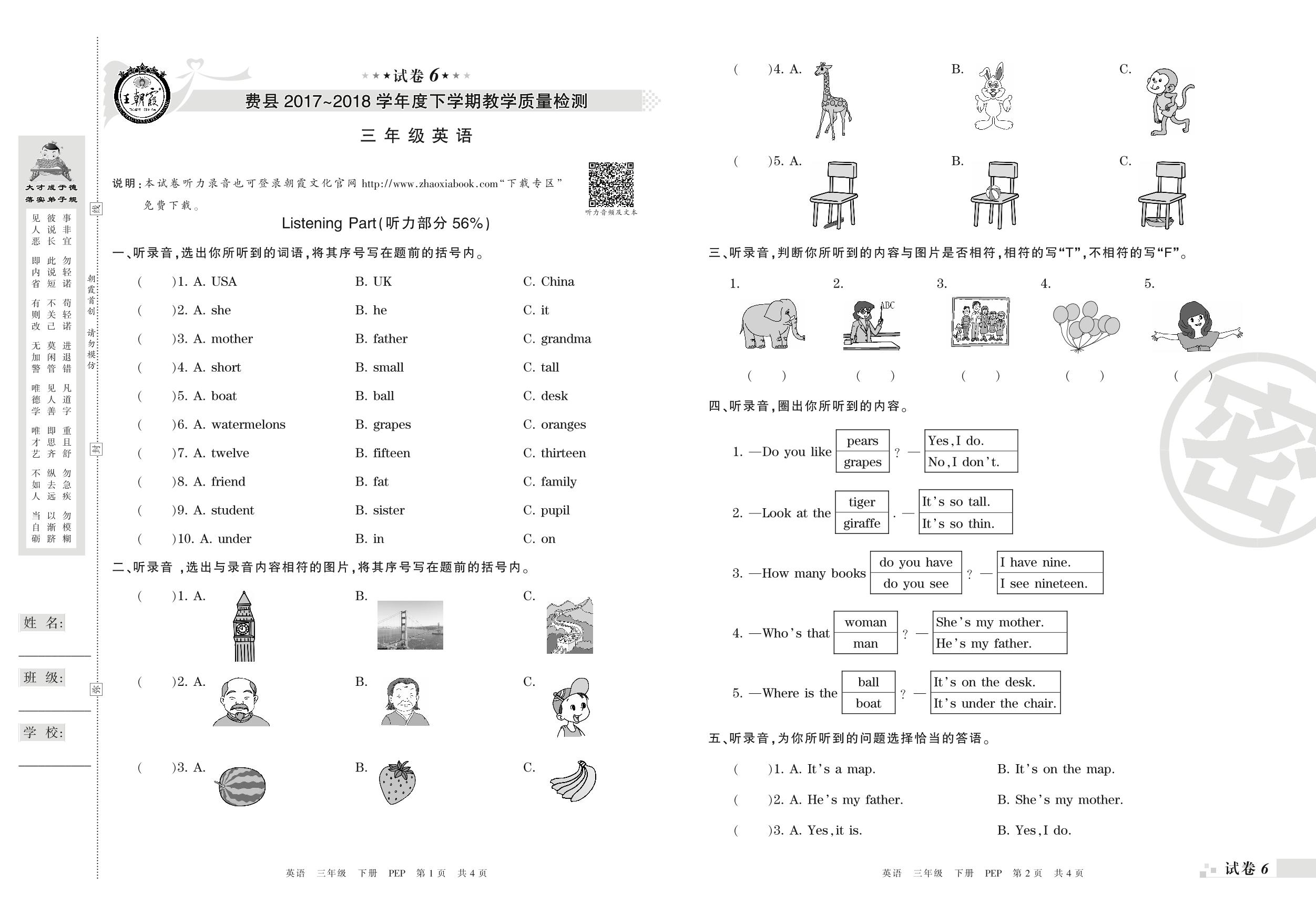 2017-2018学年第二学期临沂市费县三年级英语试卷(PEP版)【6】