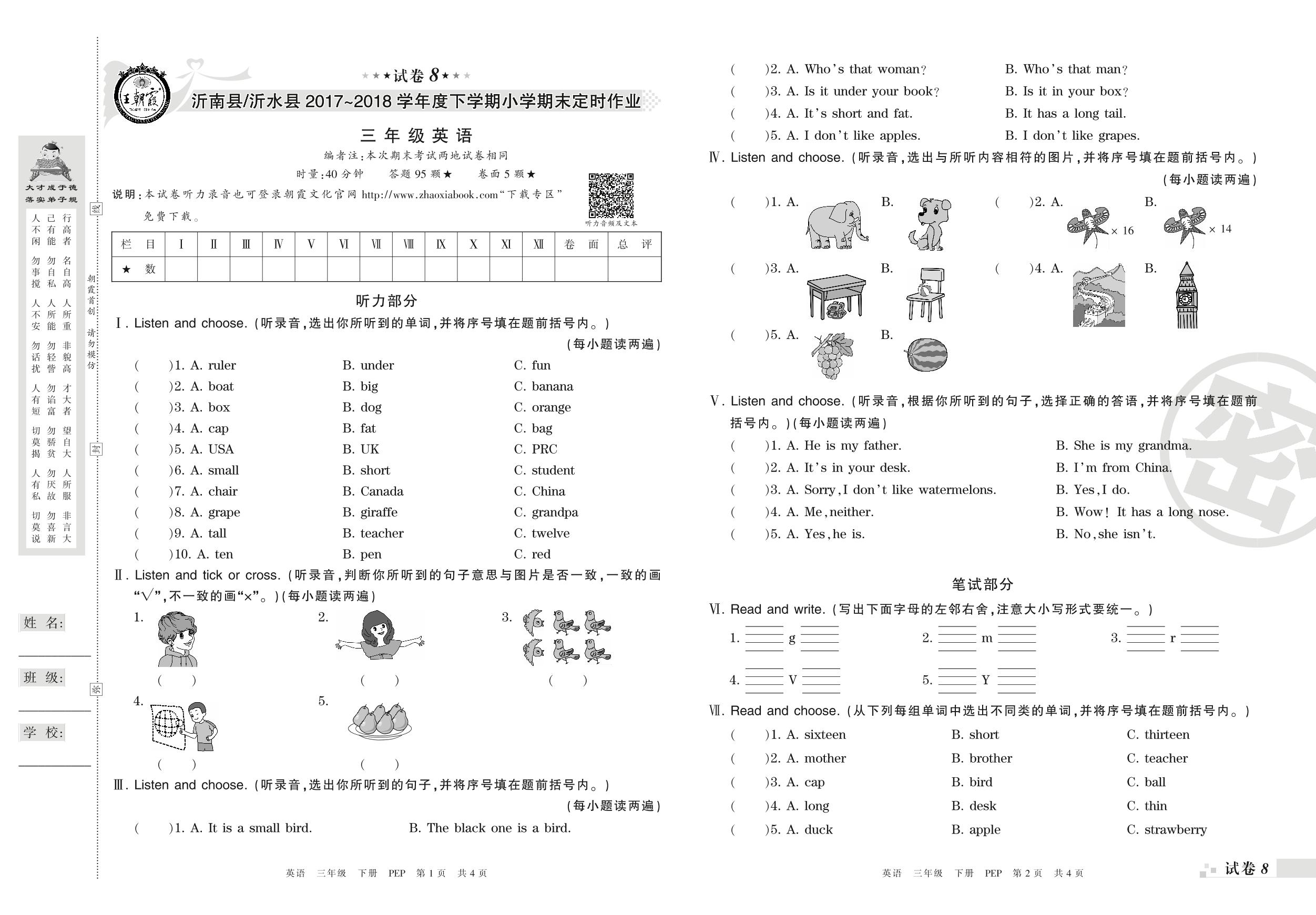 2017-2018学年第二学期临沂市沂南县、沂水县三年级英语试卷(PEP版)【8】