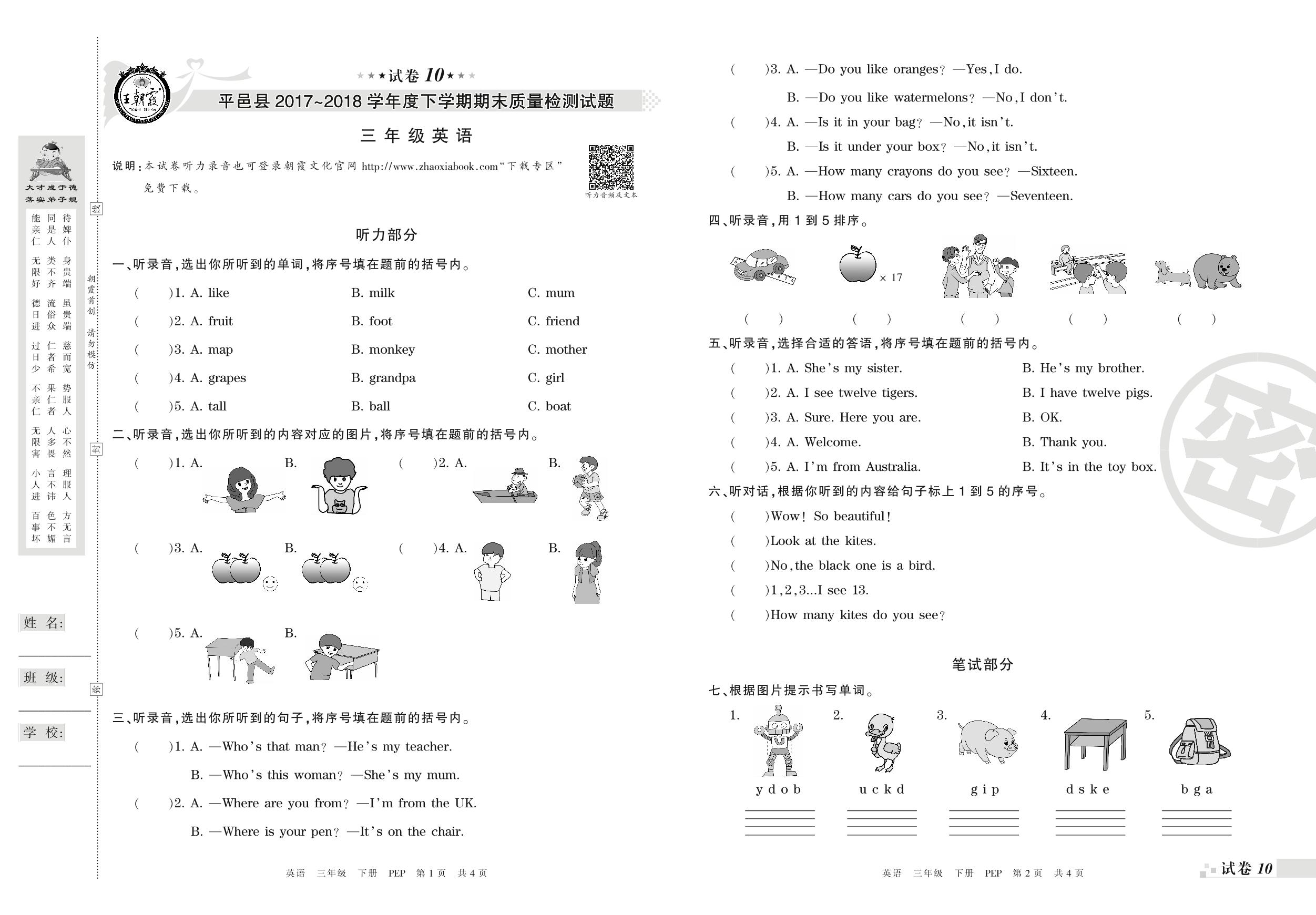 2017-2018学年第二学期临沂市平邑县三年级英语试卷(PEP版)【10】