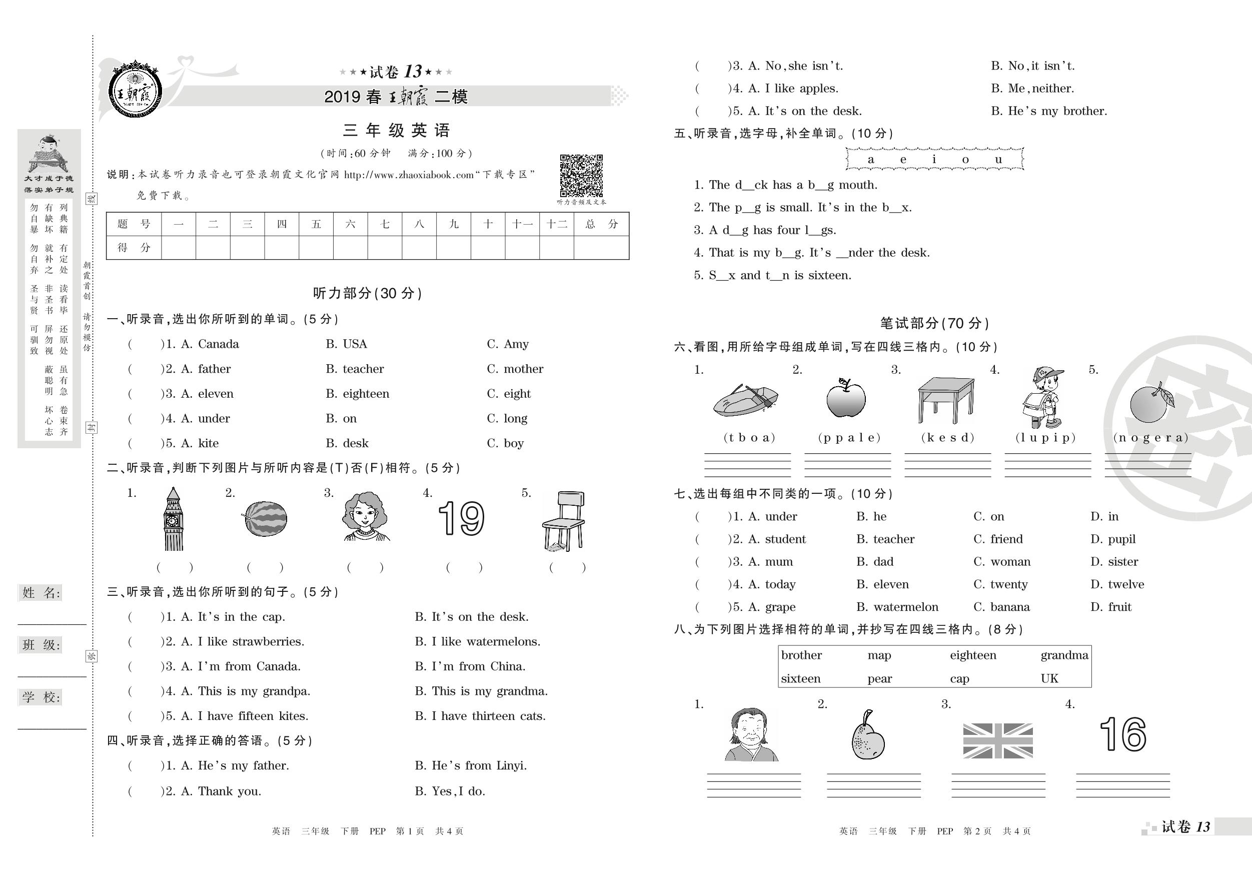 王朝霞期末模拟卷三年级下册英语(PEP版)【13】