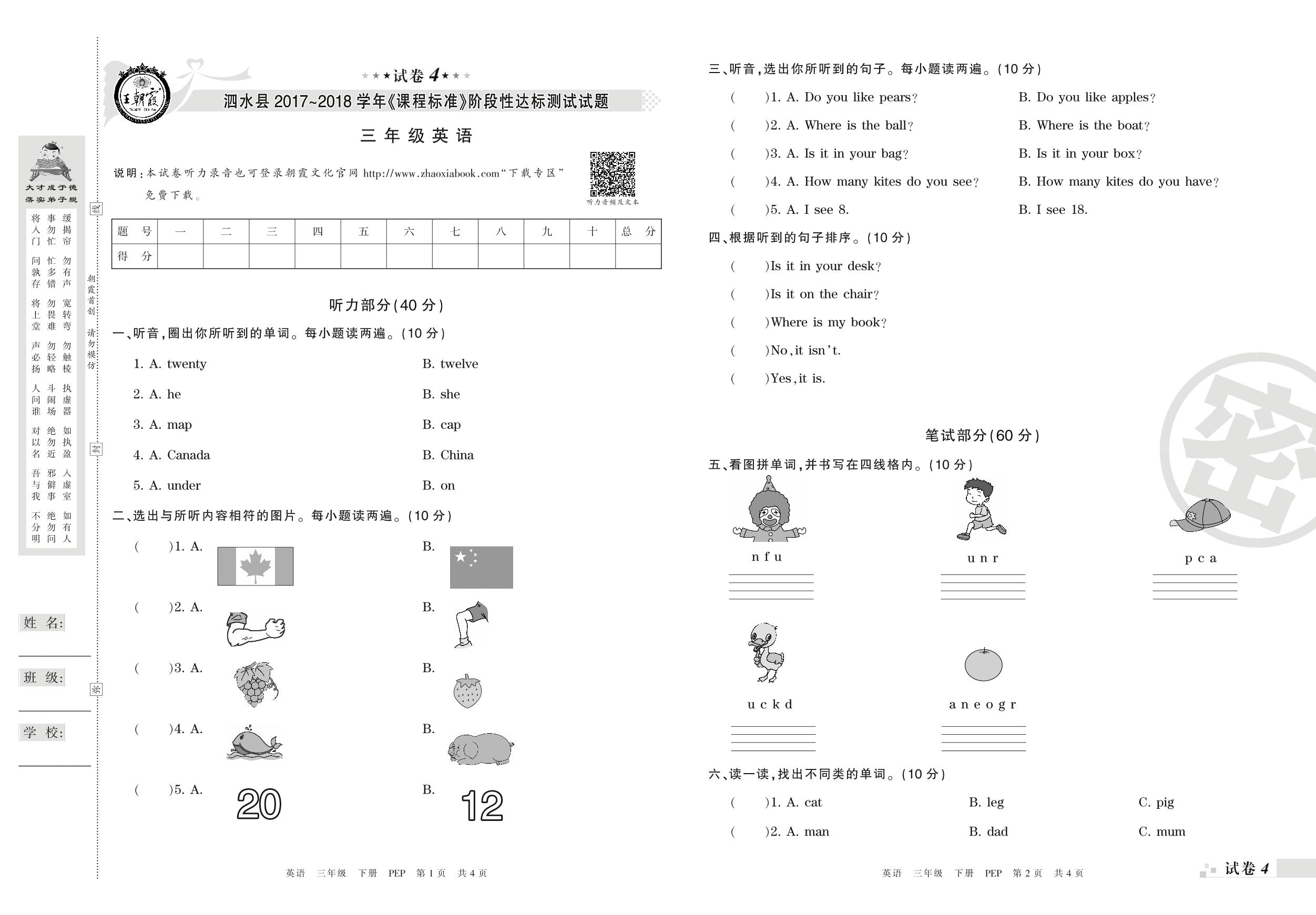 2017-2018学年第二学期济宁市泗水县三年级英语试卷(PEP版)【4】