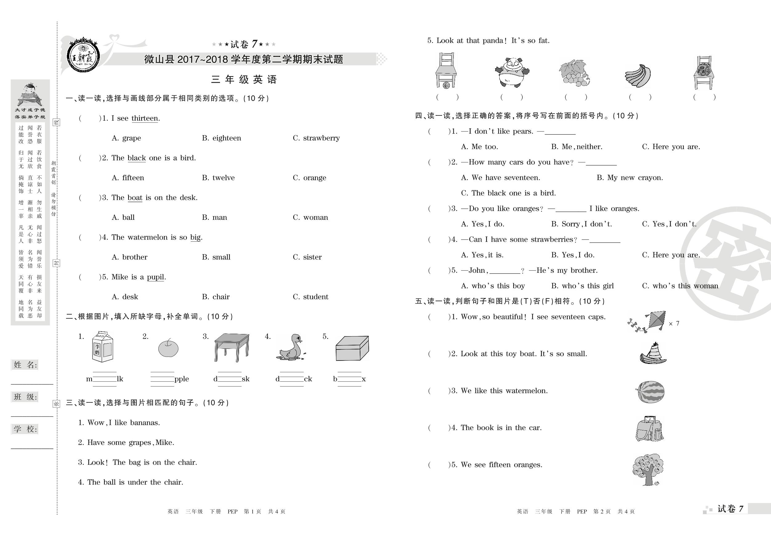 2017-2018学年第二学期济宁市微山县三年级英语试卷(PEP版)【7】
