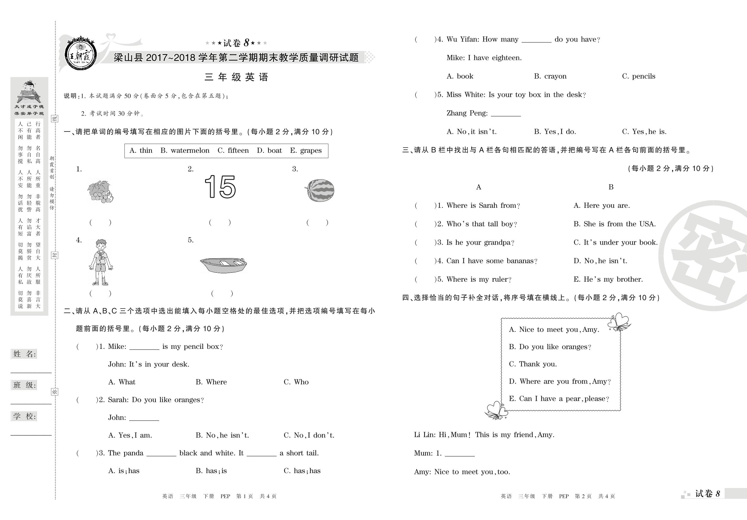 2017-2018学年第二学期济宁市梁山县三年级英语试卷(PEP版)【8】