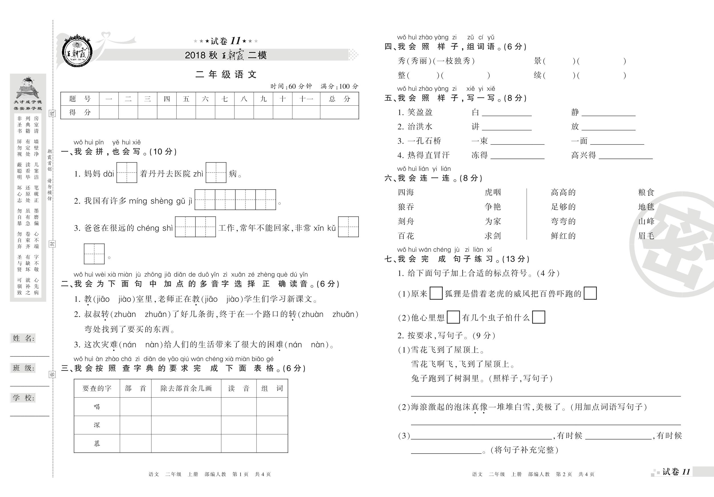 王朝霞期末模拟卷二年级上册语文(人教版)_R21080180647【11】