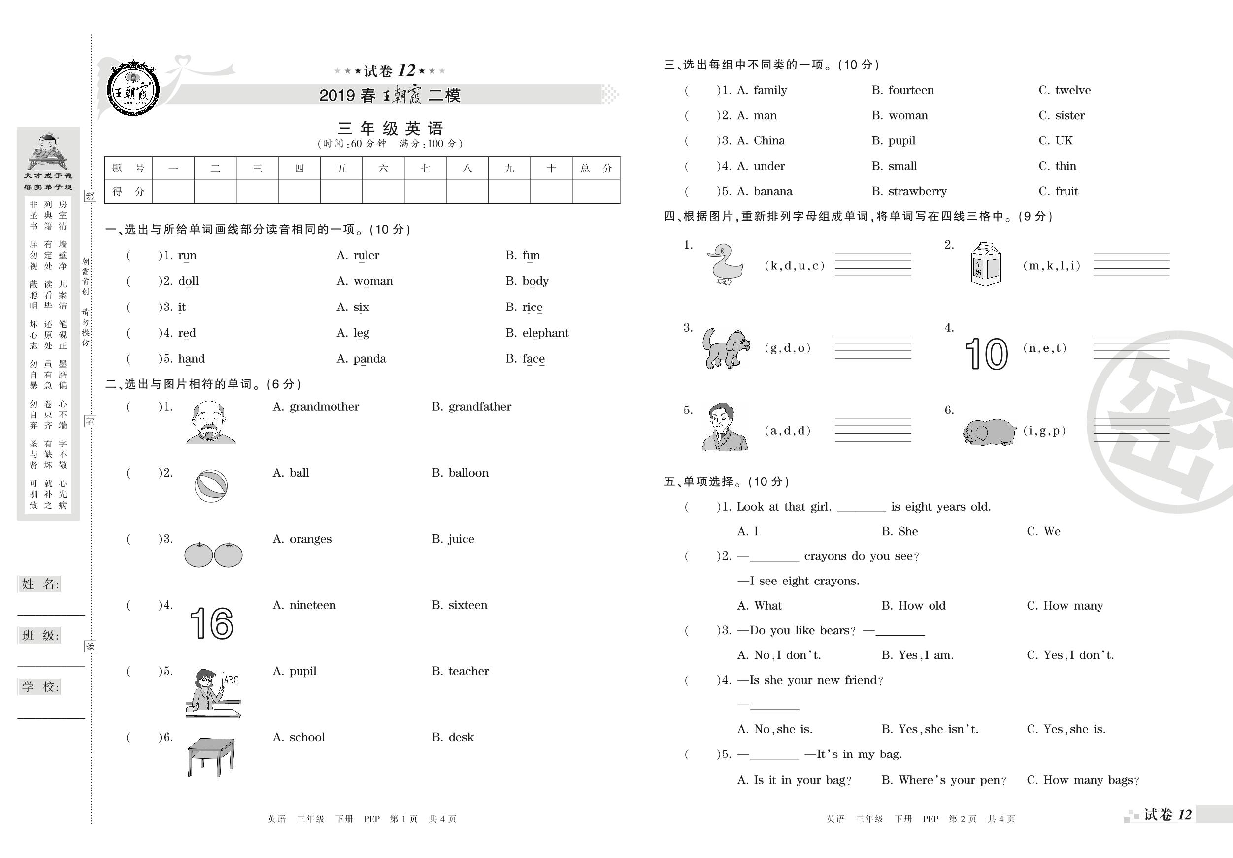 王朝霞期末模拟卷三年级下册英语(PEP版)_R210806193034【12】