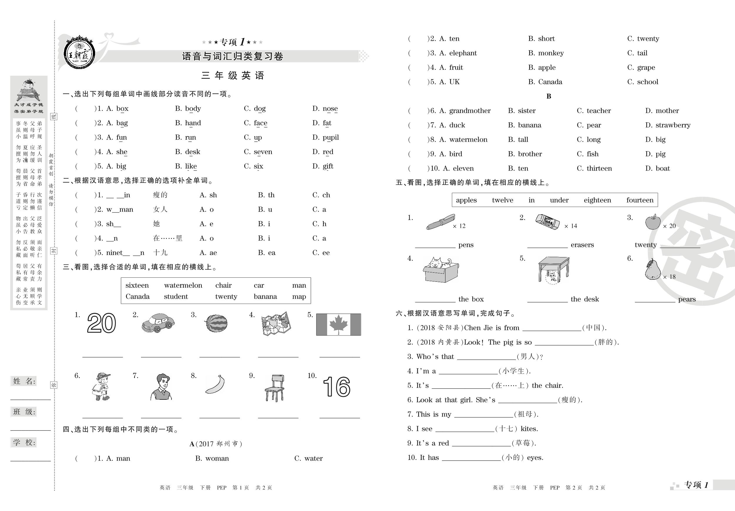 王朝霞期末专项卷——语音与词汇、句子真题归类复习卷三年级下册英语(PEP版)_R210806193046【0】