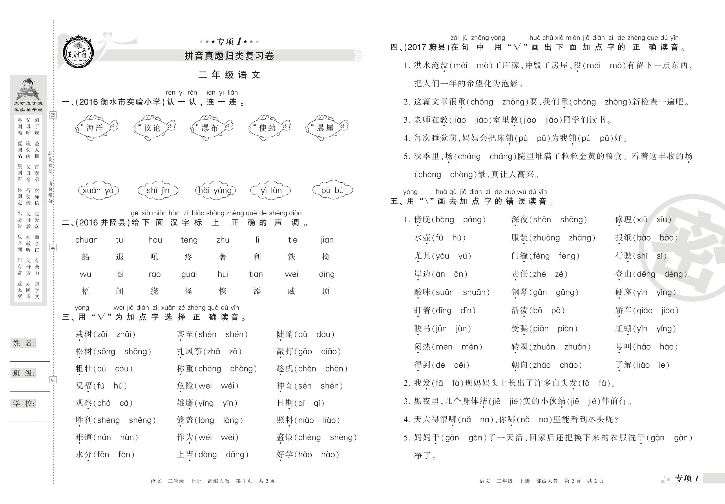 王朝霞期末专项卷——拼音、汉字真题归类复习二年级上册语文(人教版)_R21080180650【0】