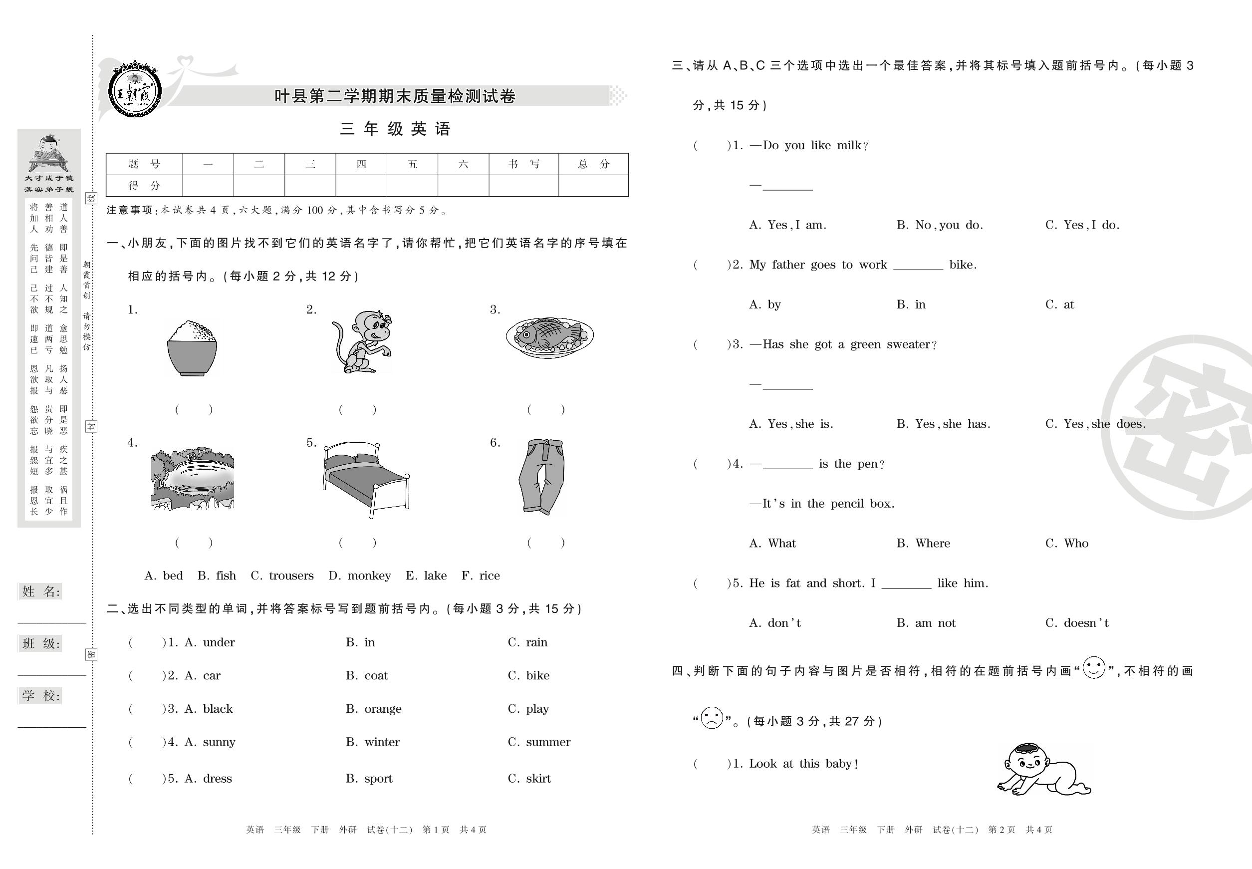 2015-2016学年第二学期平顶山市叶县三年级英语试卷(外研版)【12】