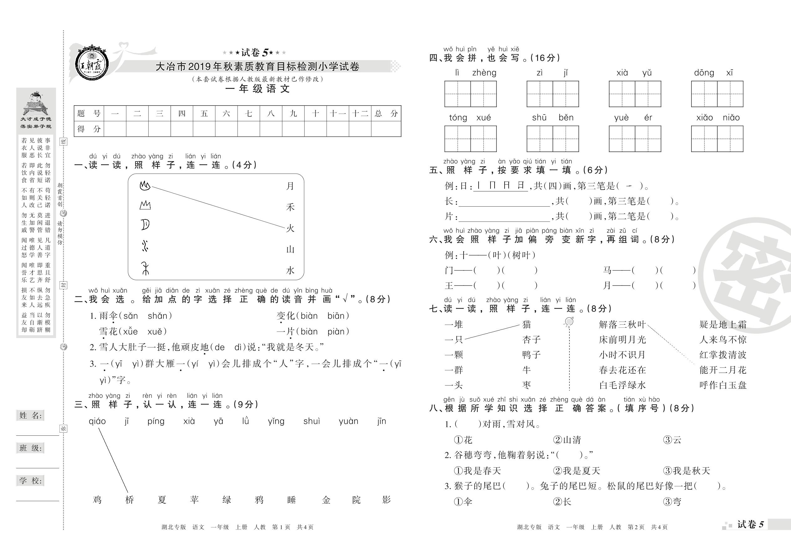 2019-2020学年第一学期大冶市一年级语文试卷(人教版)【5】