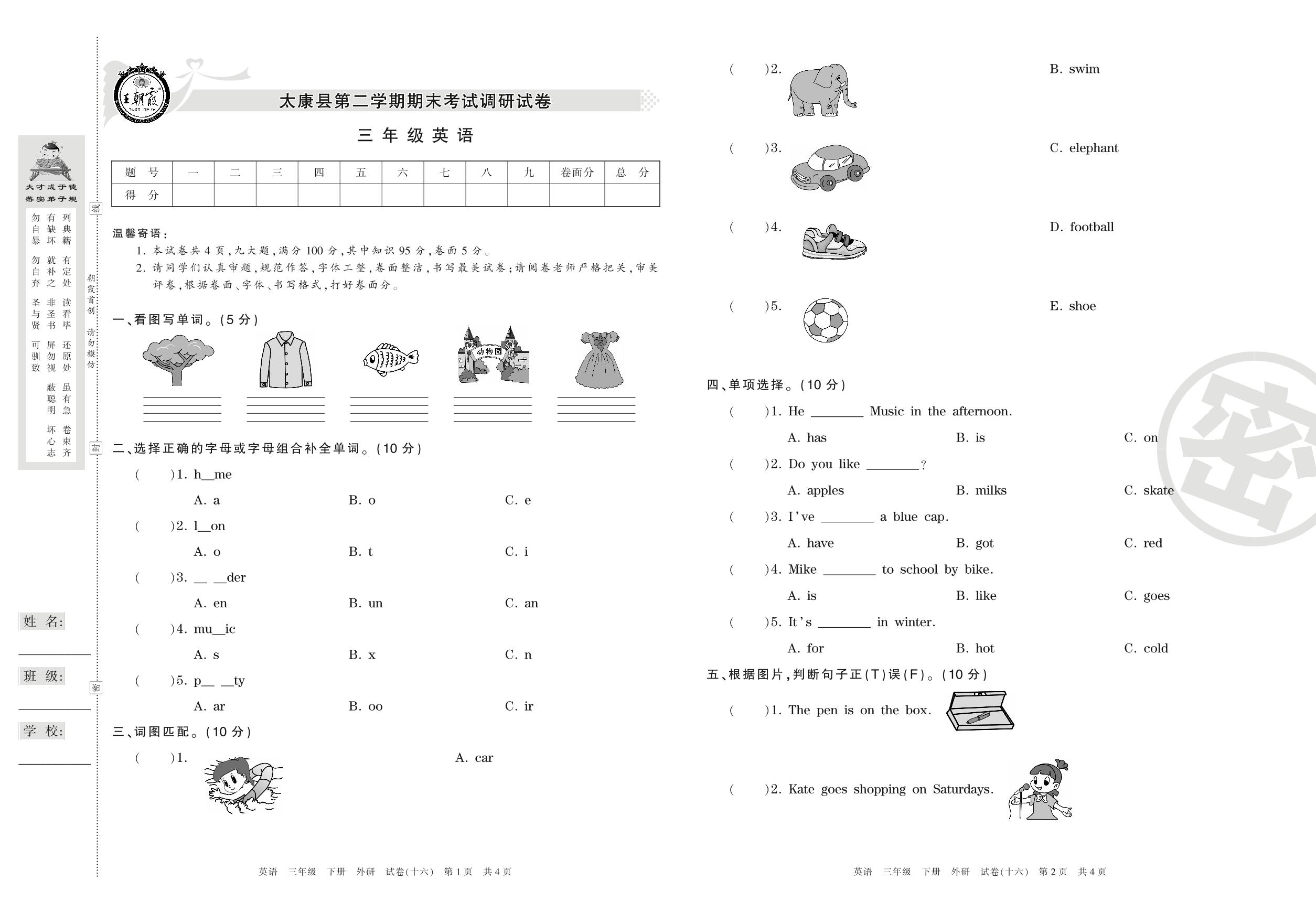 三年级英语外研版(三起始)下册期末卷