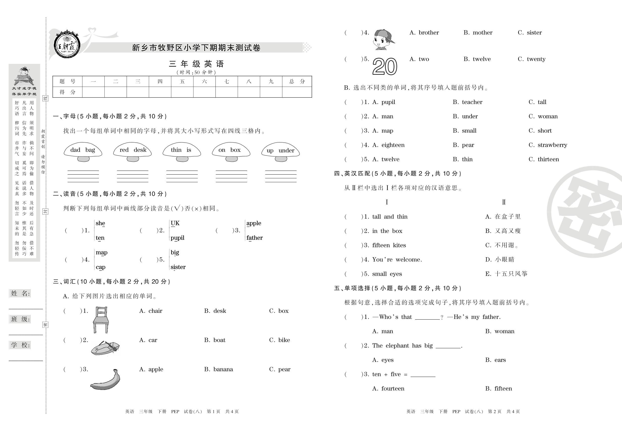 2015-2016学年第二学期新乡市牧野区三年级英语试卷(PEP版)【8】