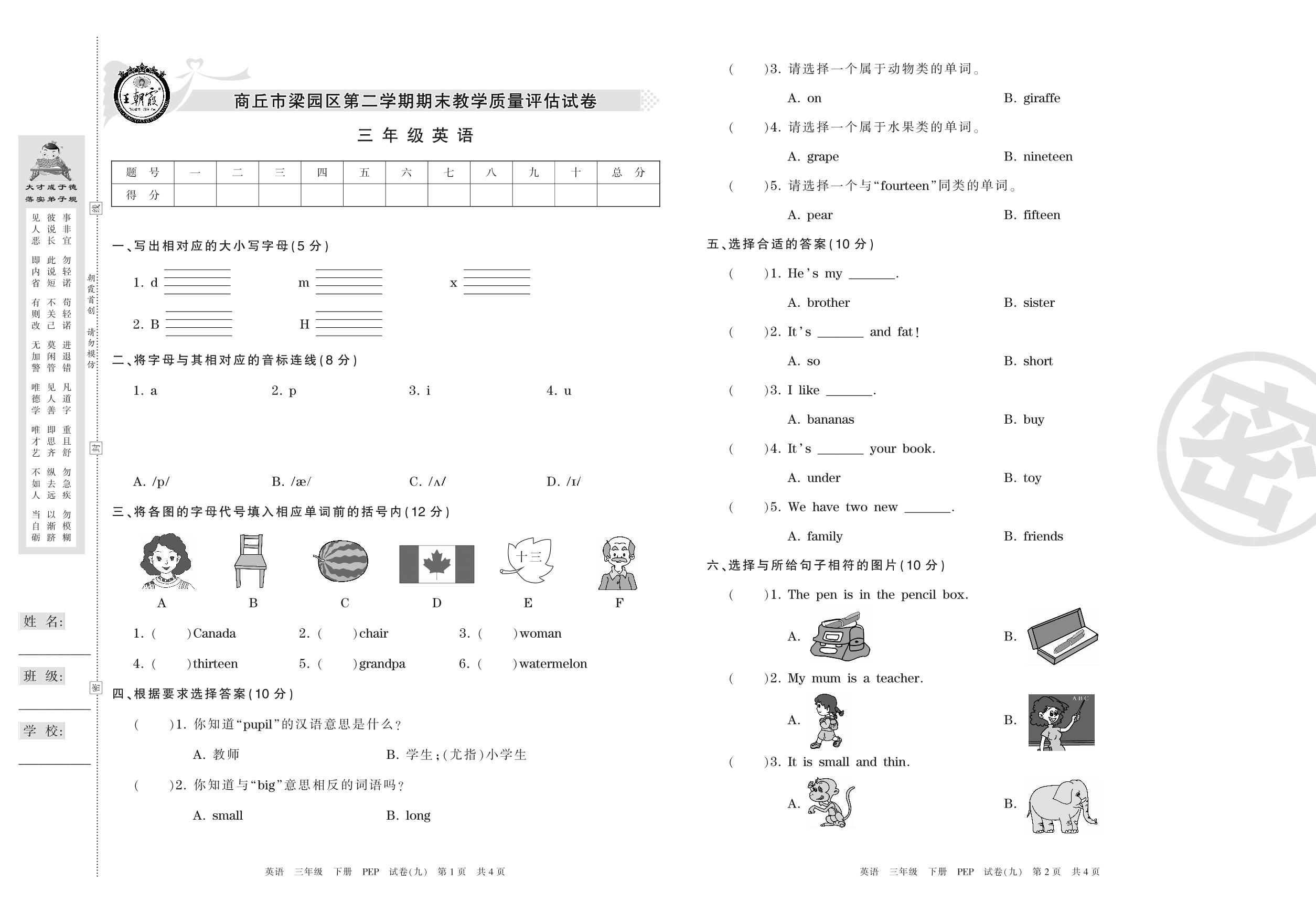 2015-2016学年第二学期商丘市梁园区三年级英语试卷(PEP版)【9】