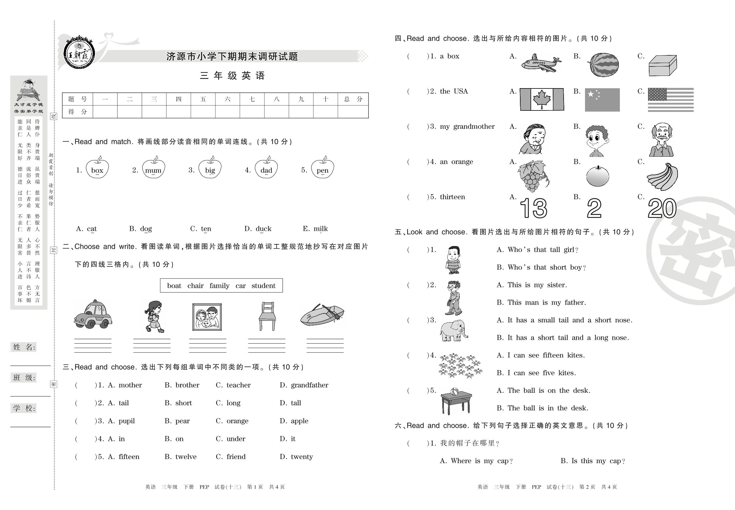 2015-2016学年第二学期济源市三年级英语试卷(PEP版)【13】