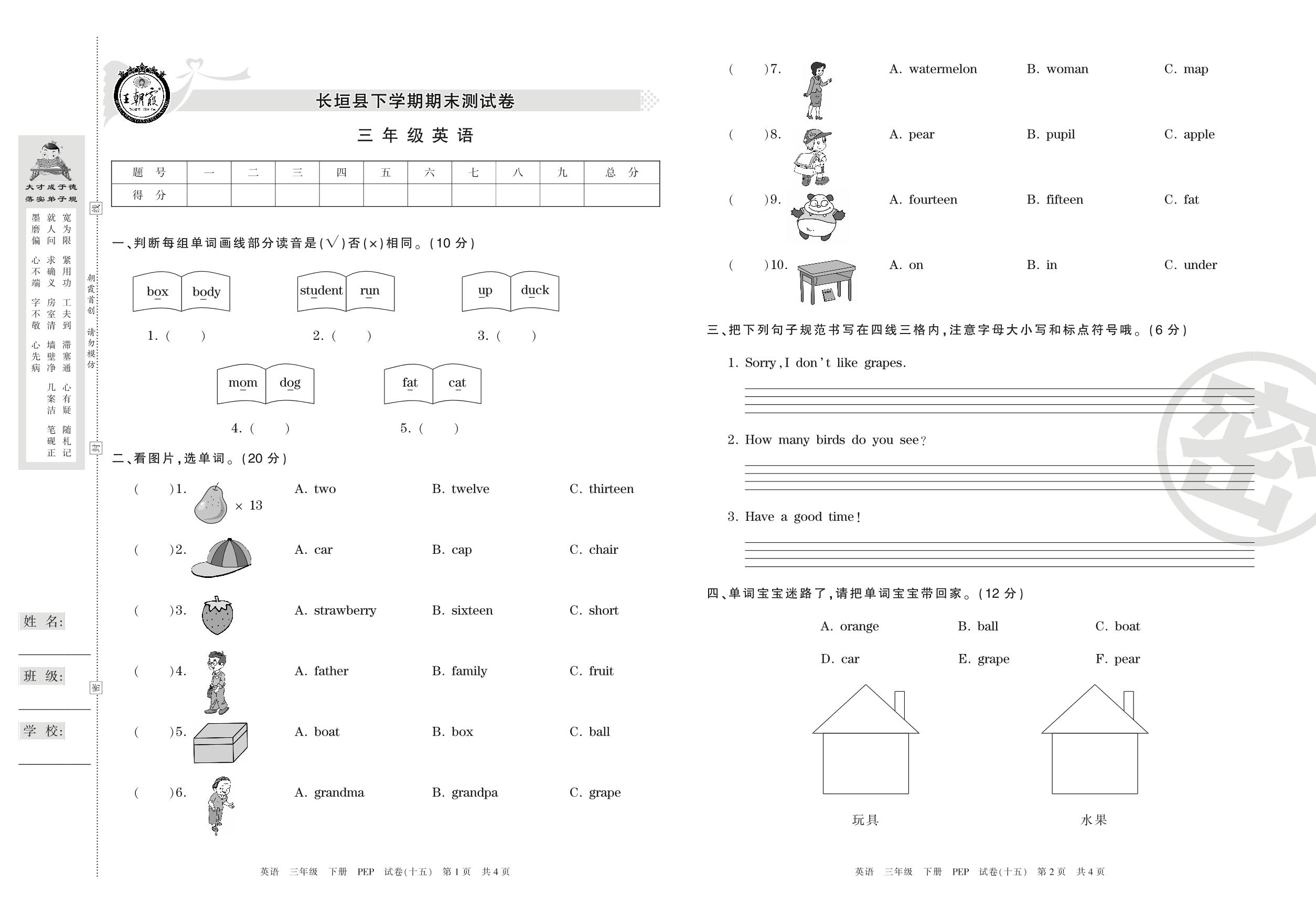 2015-2016学年第二学期新乡市长垣县三年级英语试卷(PEP版)【15】